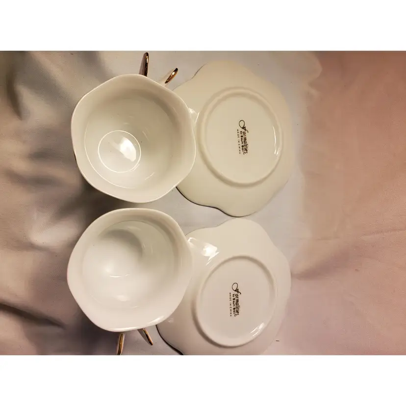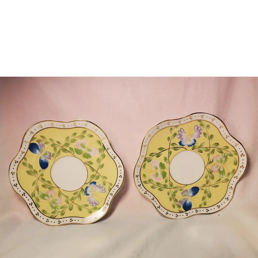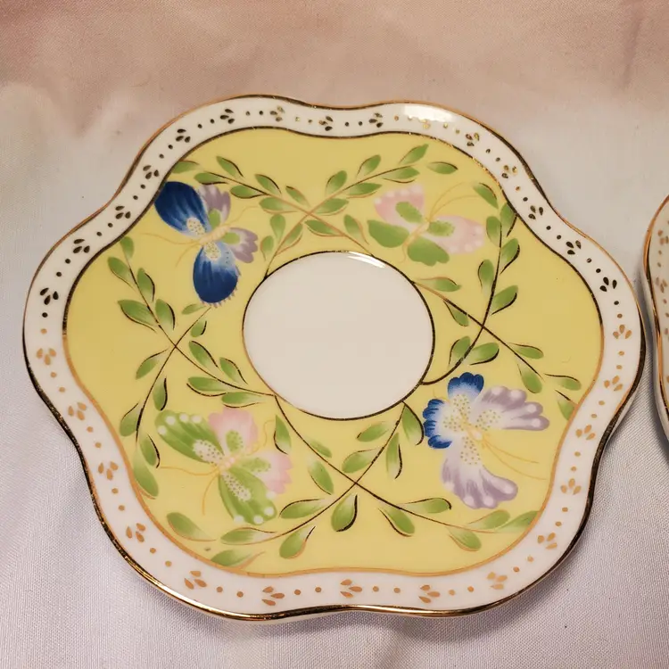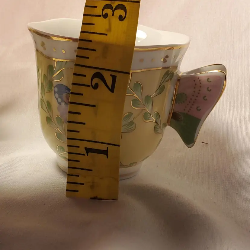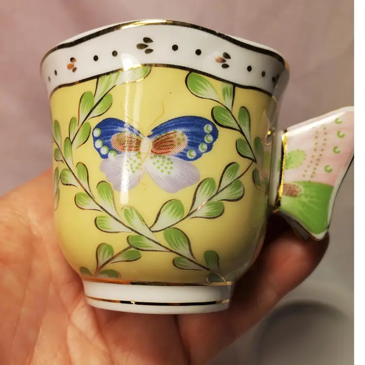 Sip your favorite tea or espresso with this charming set featuring delicate soft yellow background with butterfly and floral designs and gold trim edges. Includes two cups two saucers, perfect for a cozy afternoon. Preowned In excellent condition with no visible wear.