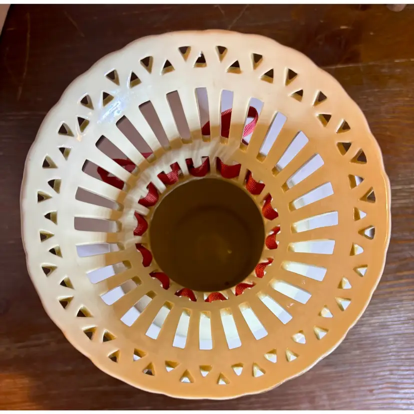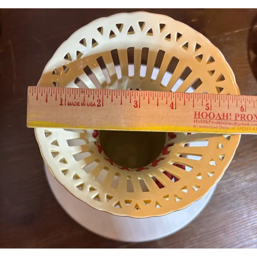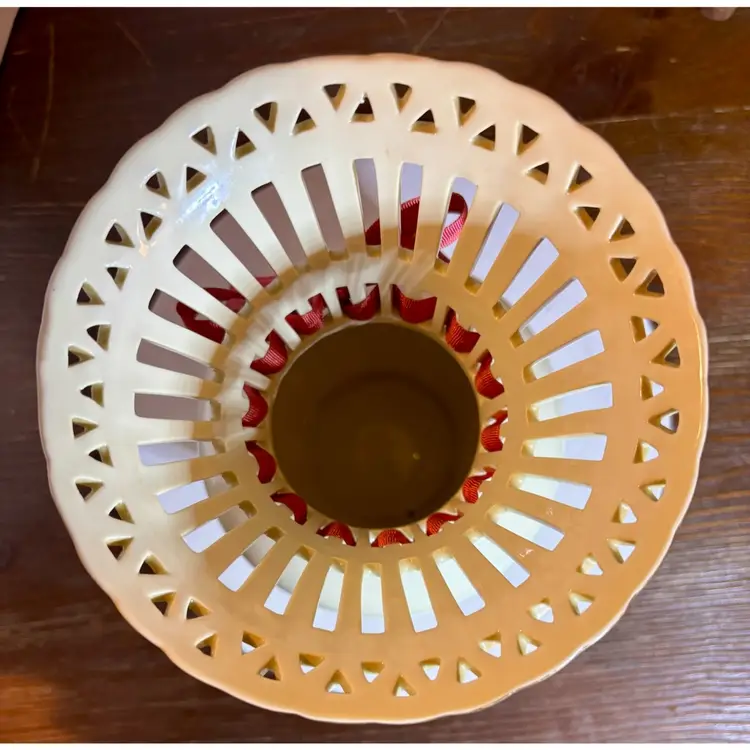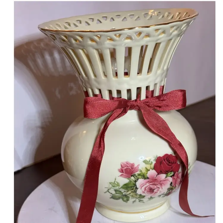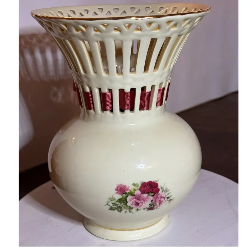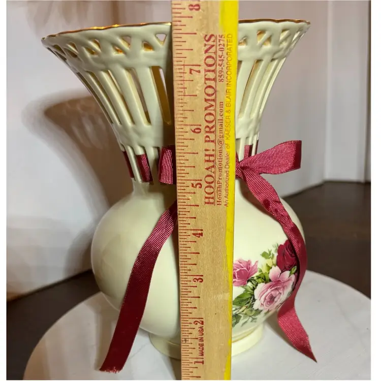 Pink and burgundy roses and matching removable ribbon Beautiful vase! No chips cracks breaks or wear! Great condition! Would look great as is or with a floral arrangement in it or just some beautiful greenery!