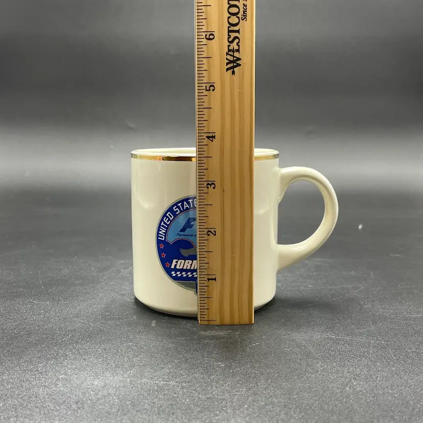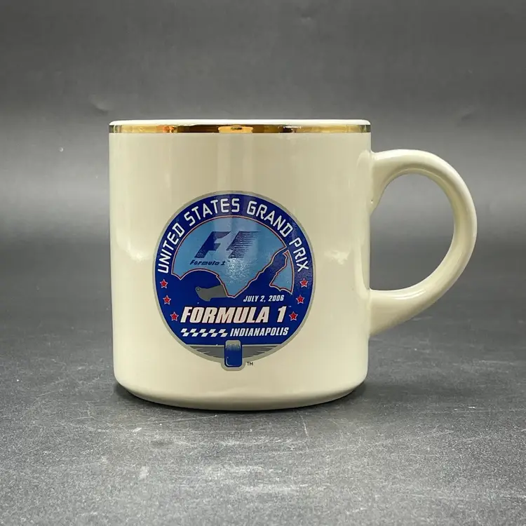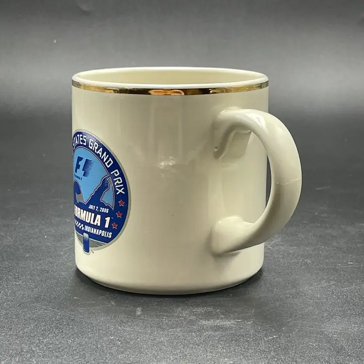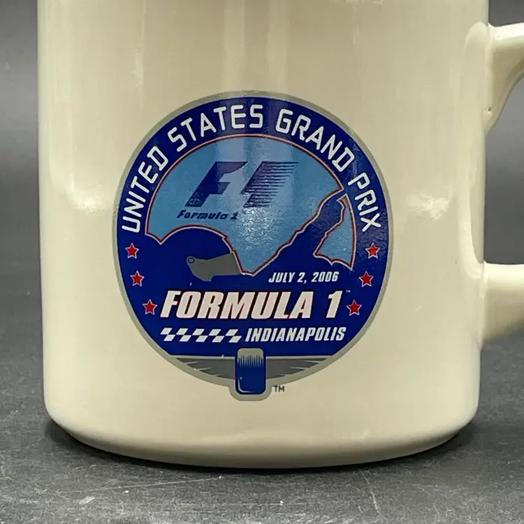 This is a rare Formula 1 United States Grand Prix July 2 2006 coffee mug. Measures approximately 3.5" tall x 3.25" across, and holds approximately 12fl oz. There is a bit of gold loss on the lip as shown in pictures. No chips or cracks. #239