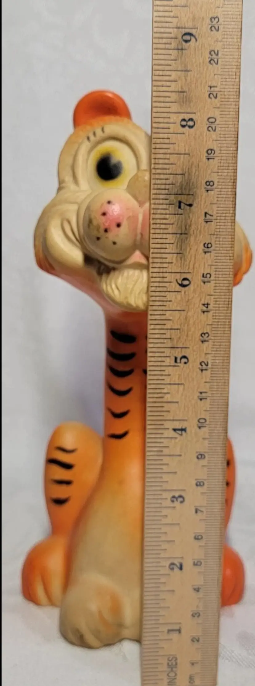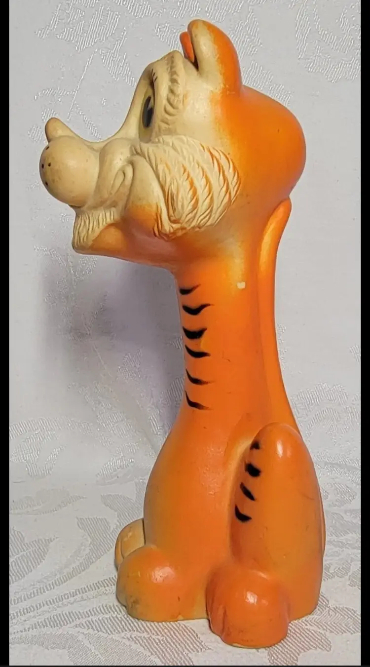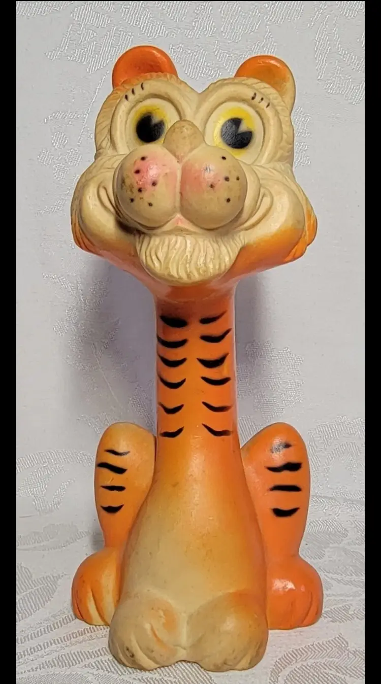 This vintage Tiger Squeaky Toy from Formulette Company is a great addition to any collection. Made in the USA in 1962, this toy features an adorable orange tiger character design. It is a vintage item that has remained in good condition over the years and is sure to provide joy to whoever decides to add it to their collection. This toy is perfect for fans of vintage and antique toys, or anyone who appreciates the unique design of this particular item.