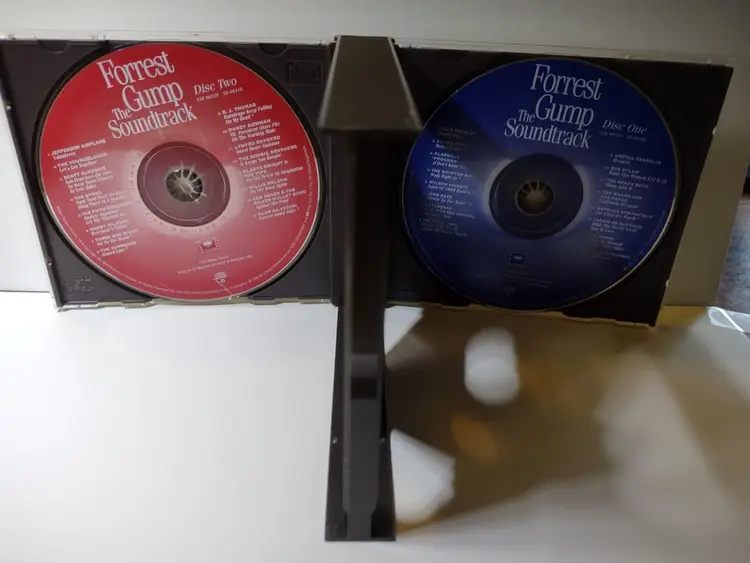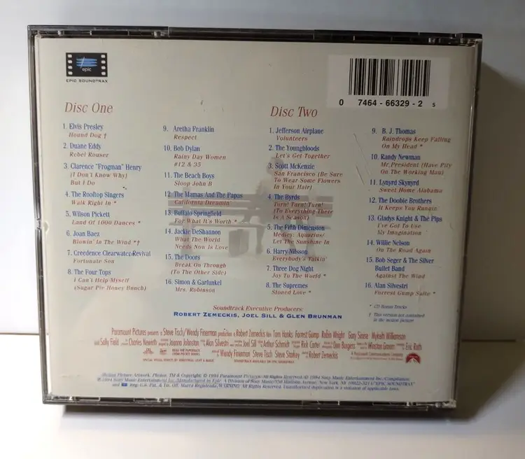 Artist: Original Soundtrack CD Grading: Good Plus (G+) Record Label: Sony Music Distribution Release Title: Forrest Gump [Remaster] Case Type: Double Fat Case Custom Bundle: No Color: Silver Case Condition: Good Plus (G+) Inlay Condition: Very Good Plus (VG+) Modified Item: No Edition: First Edition Type: Album Format: CD Language: English Release Year: 1994 Style: 1950s, 1960s, 1970s, 1980s, Pop Rock Features: Original Cover, Original Inner Sleeve Genre: Rock, Folk Rock, Rock & Pop Country/Region of Manufacture: United States