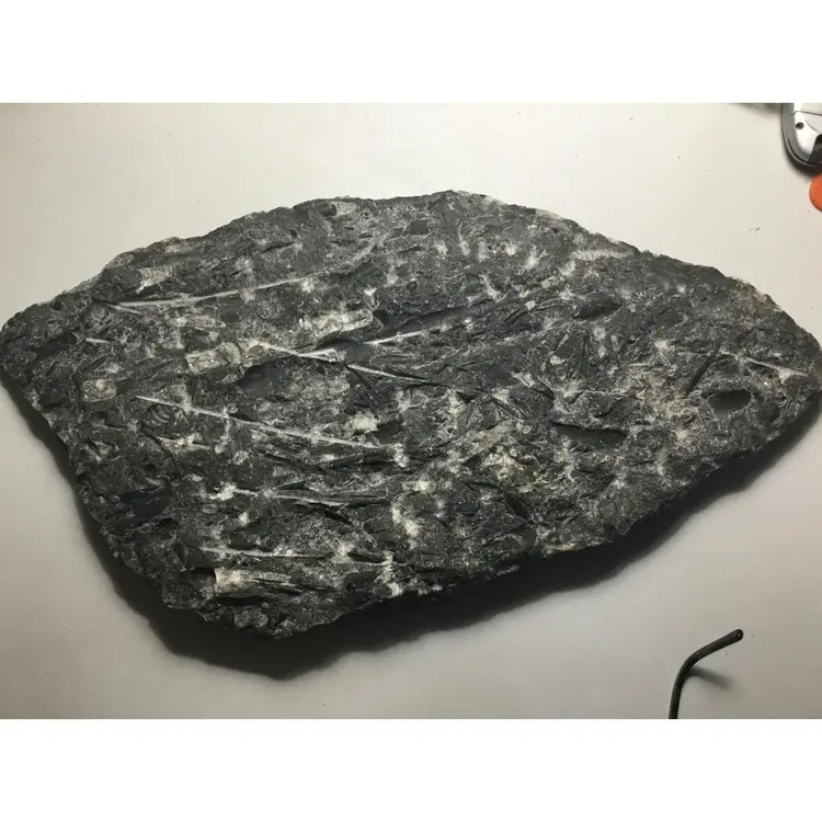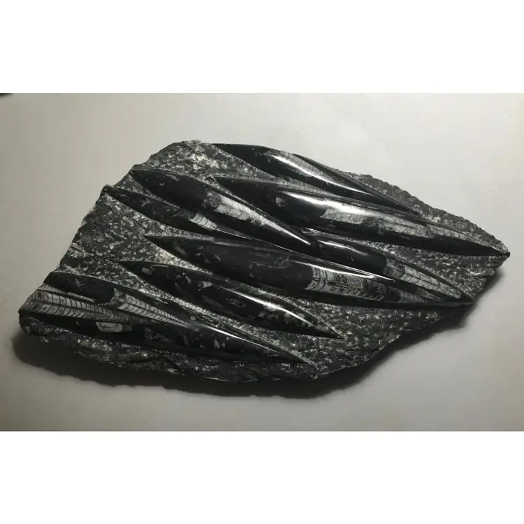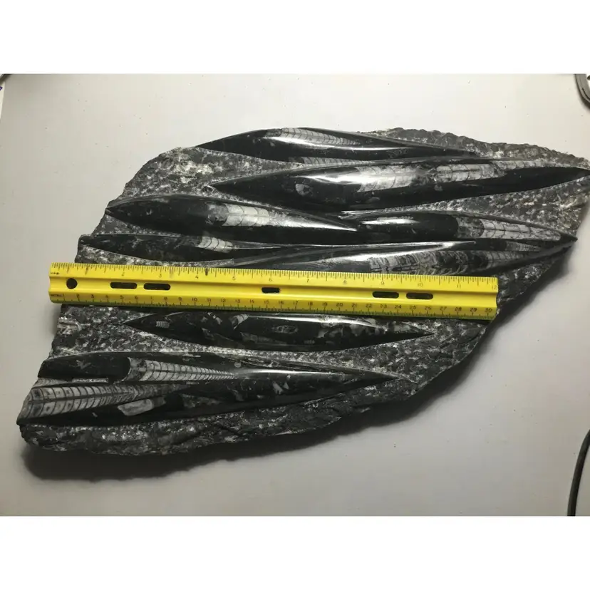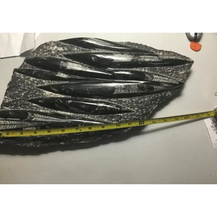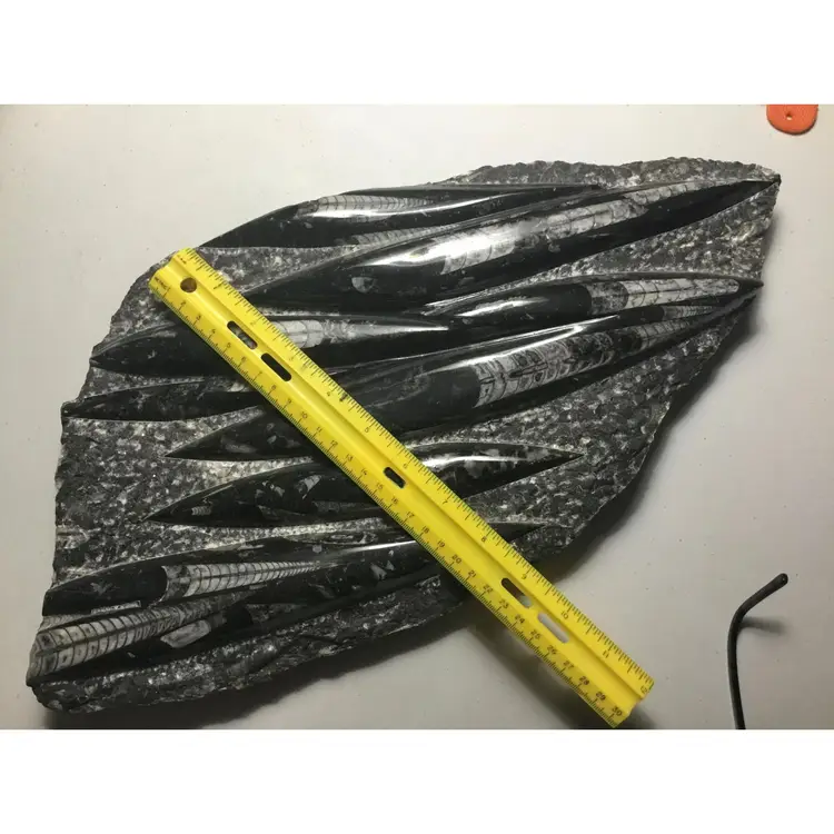 Large slab of Orthoceras fossils, 17 inches by 10 inches, 9 and 3/4 pounds, polished on top side only, includes 8+ fossil examples in rock slab.