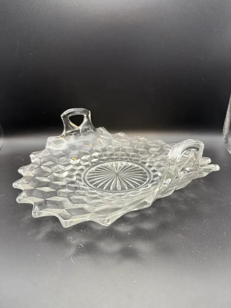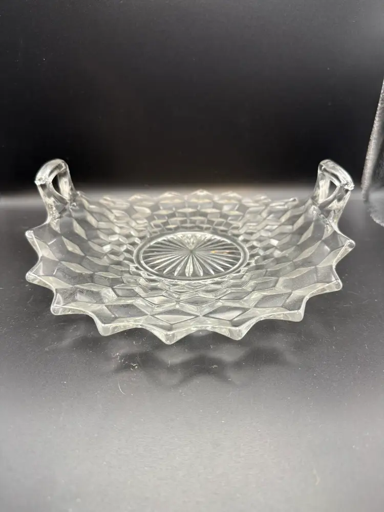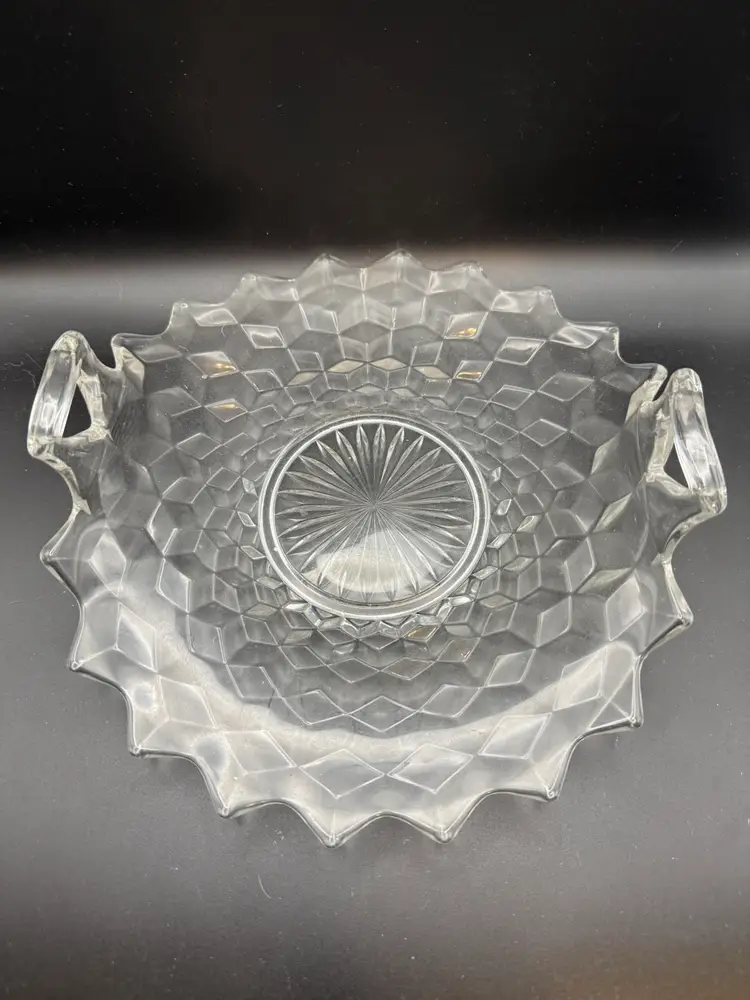 This piece belongs to the Fostoria American Clear pattern, which was produced from 1915 to 1982 and is known for its distinctive cubist design and fire-polished finish. The specific piece in the image is the Handled Muffin Tray (Mold #003-021). This measures around 10 inches in length or diameter.