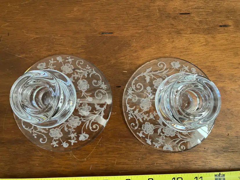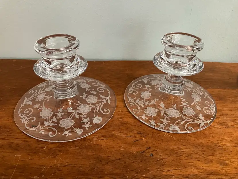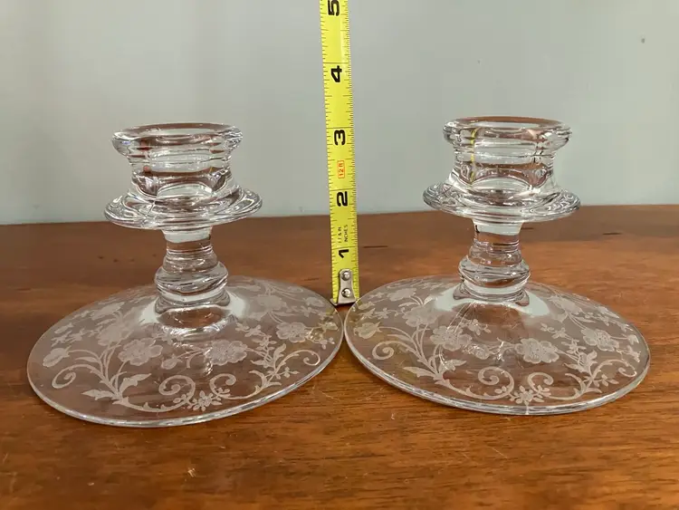 Fostoria “buttercup pattern” candle holders set of 2. No chips, cracks or fleas.