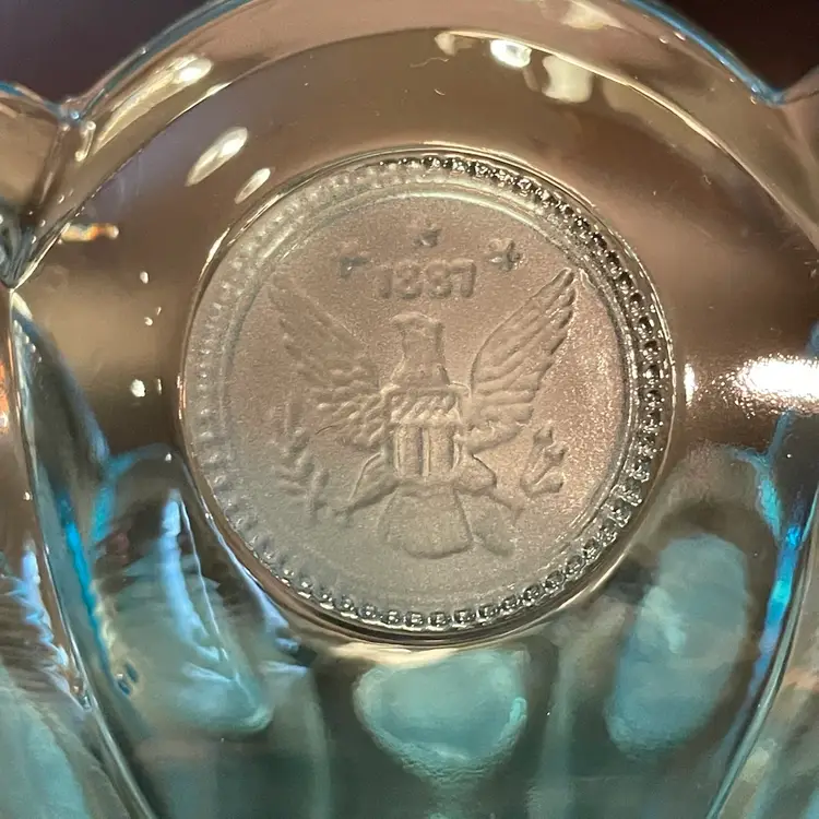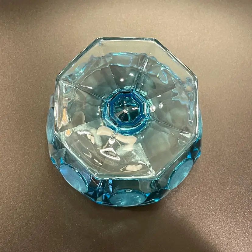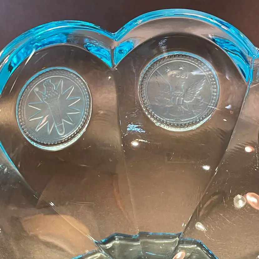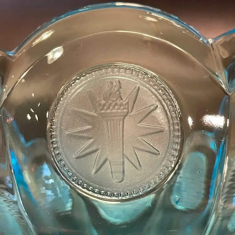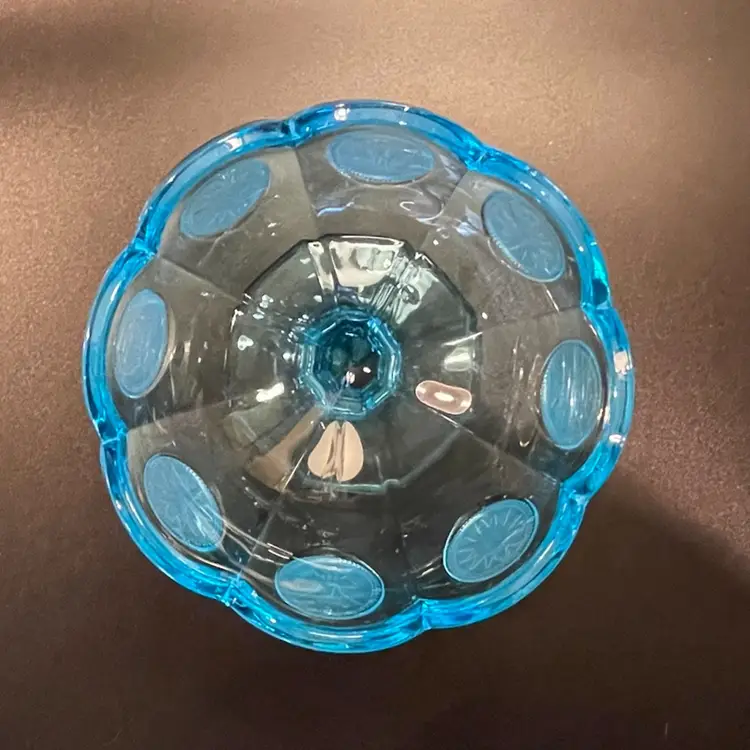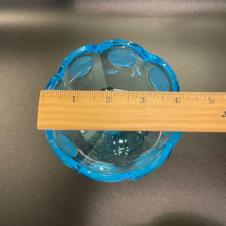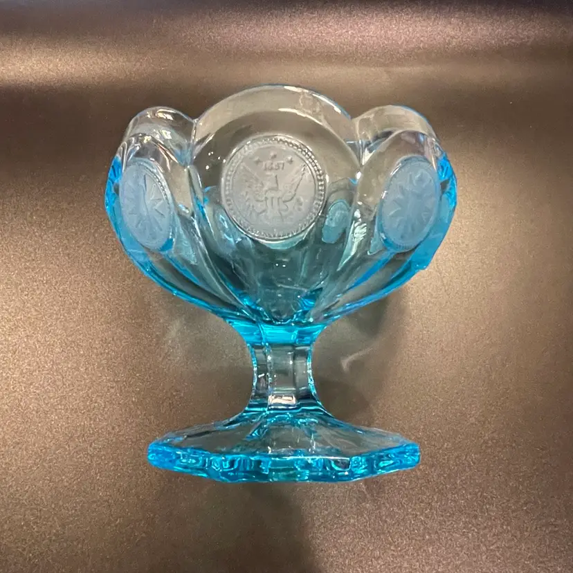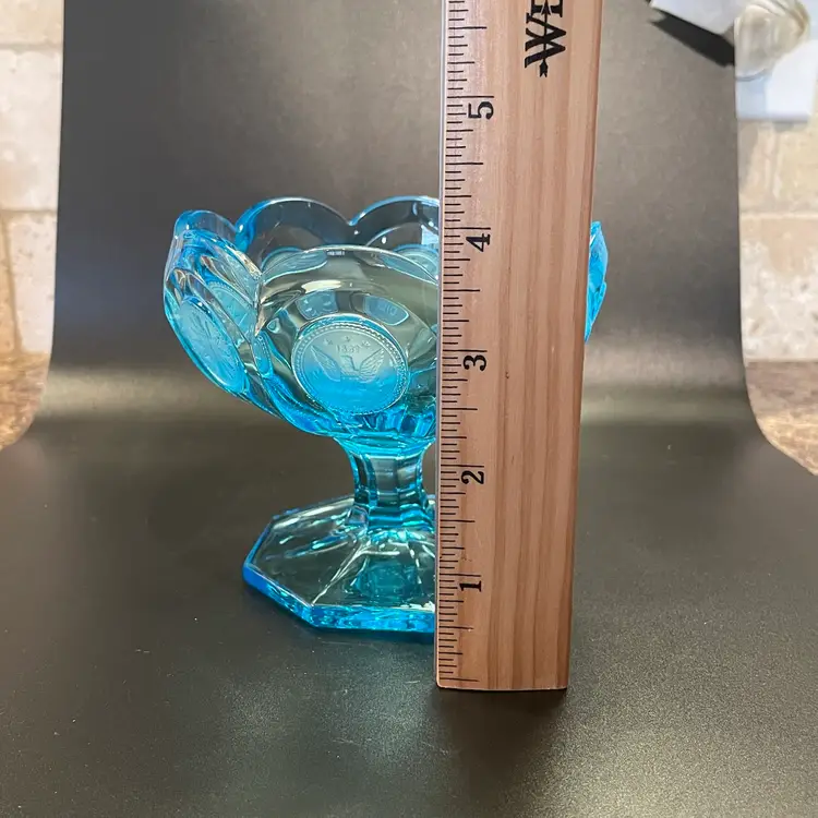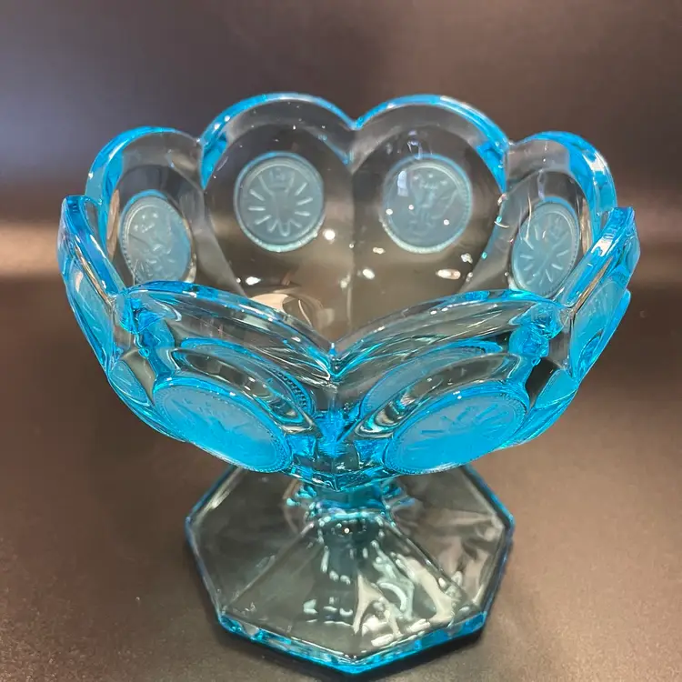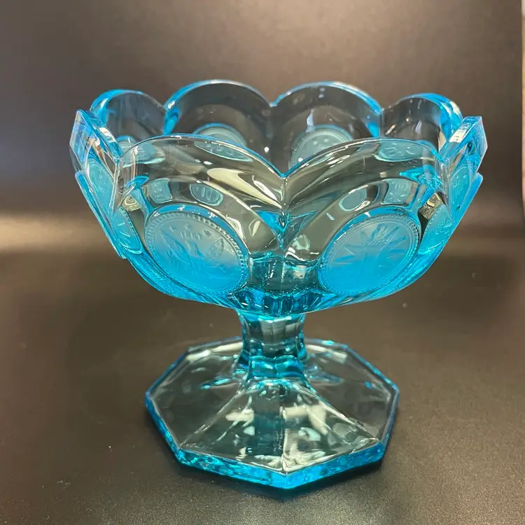 This is a vintage ice blue Fostoria Coin Glass compote dish. There is a slight glow under blacklight. Measures approximately 4" across the top x 3.75" tall. No chips or cracks.