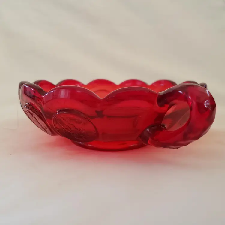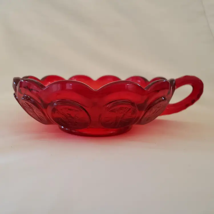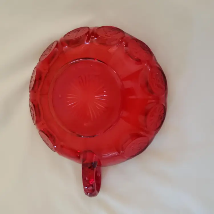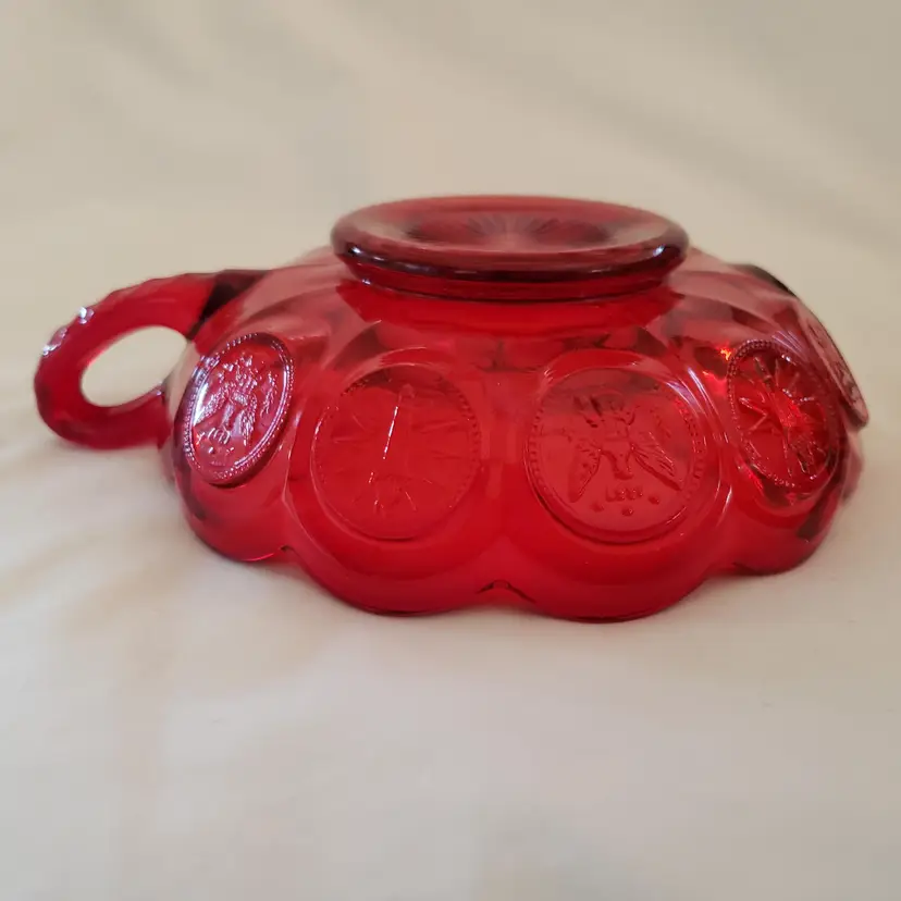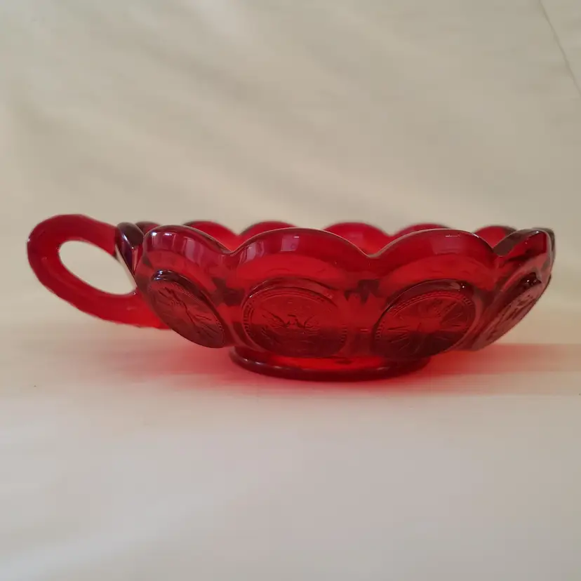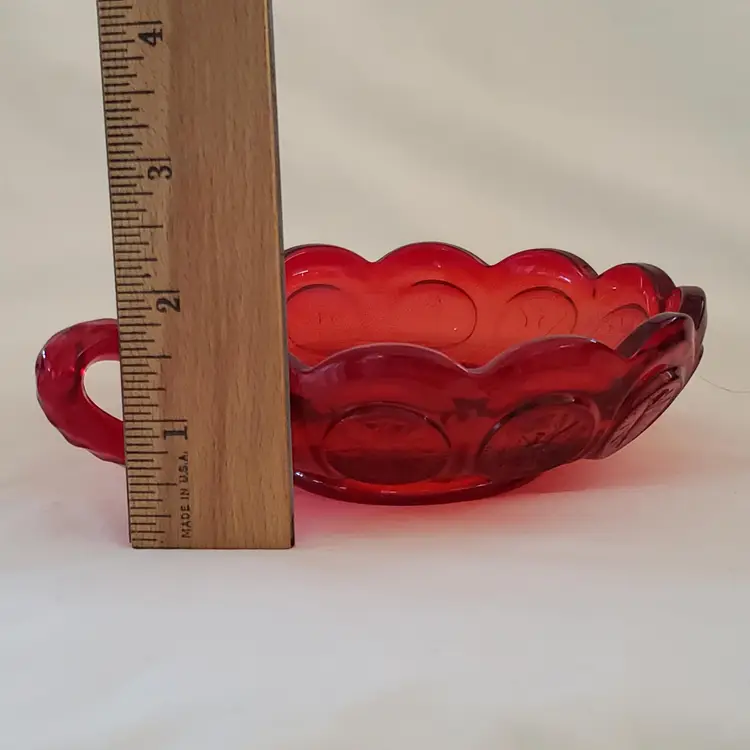Fostoria Coin Glass Ruby Red Handled Cup / Candy Dish Glowy Bottom 6¼" Wide 1¾" Tall. Used condition with no apparent issues that I can see. Please view all the photos and read the entire item description and please ask any questions prior to purchase when possible.