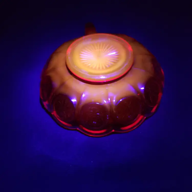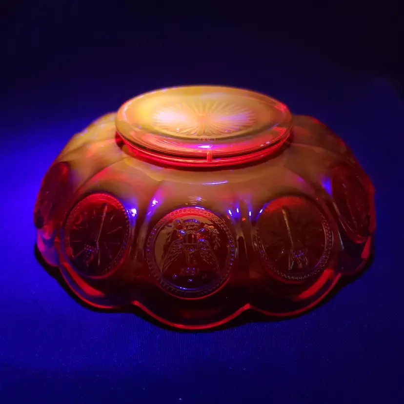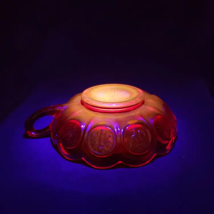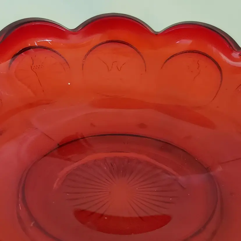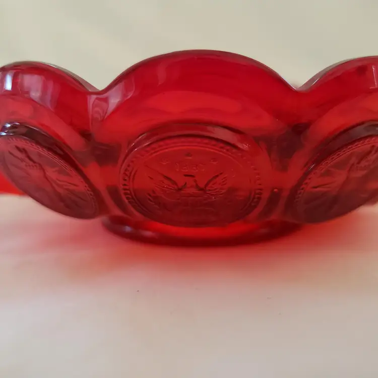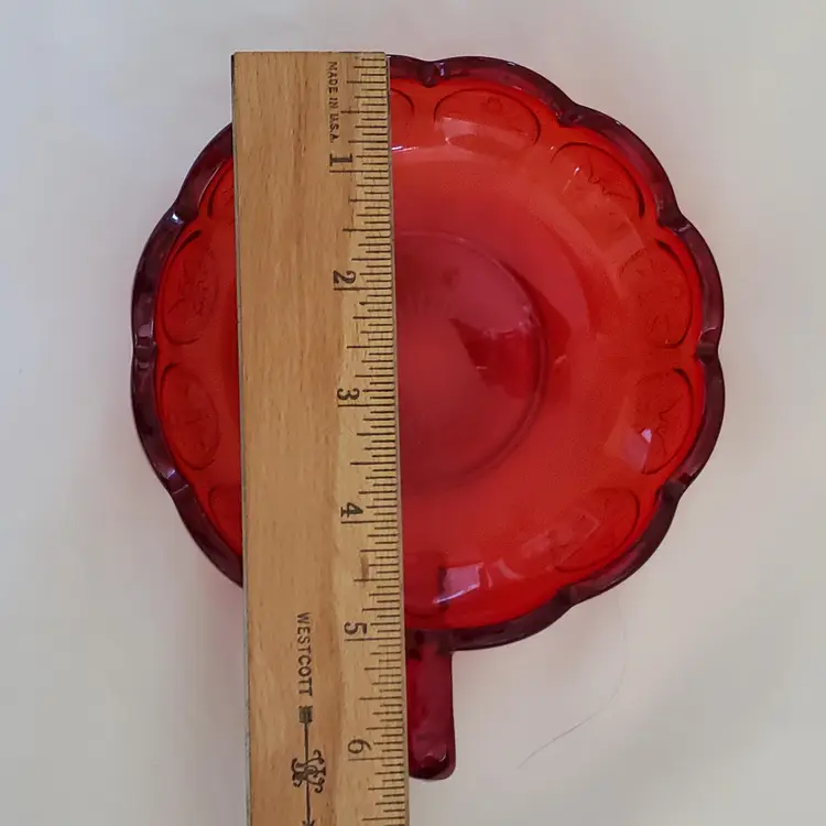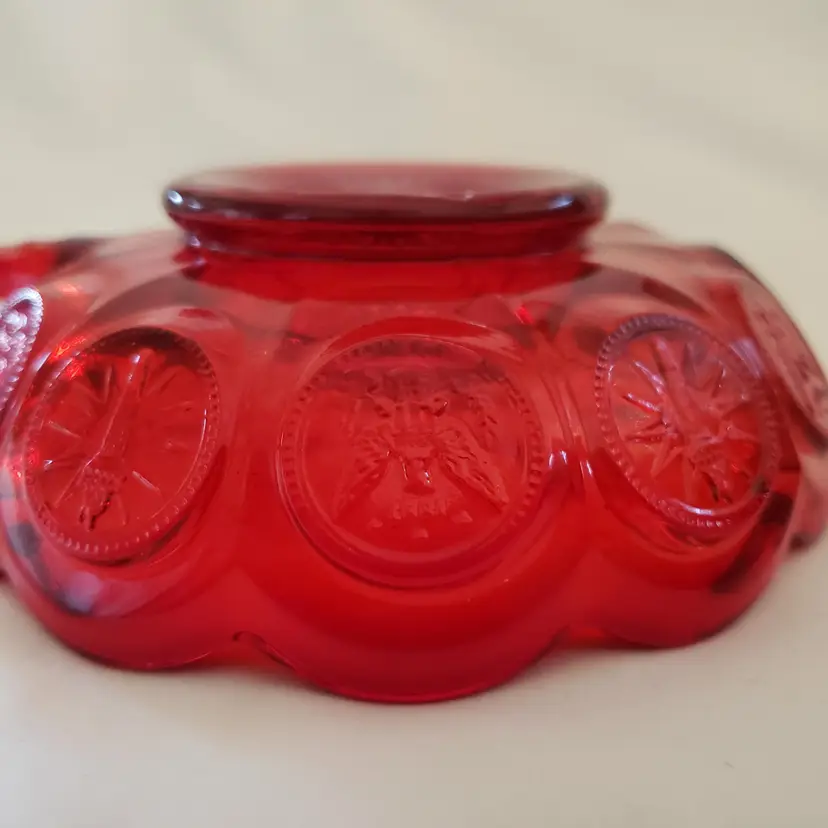 Fostoria Coin Glass Ruby Red Handled Cup / Candy Dish Glowy Bottom 6¼" Wide 1¾" Tall. Used condition with no apparent issues that I can see. Please view all the photos and read the entire item description and please ask any questions prior to purchase when possible.