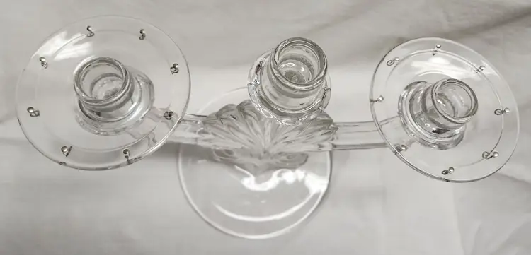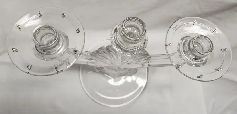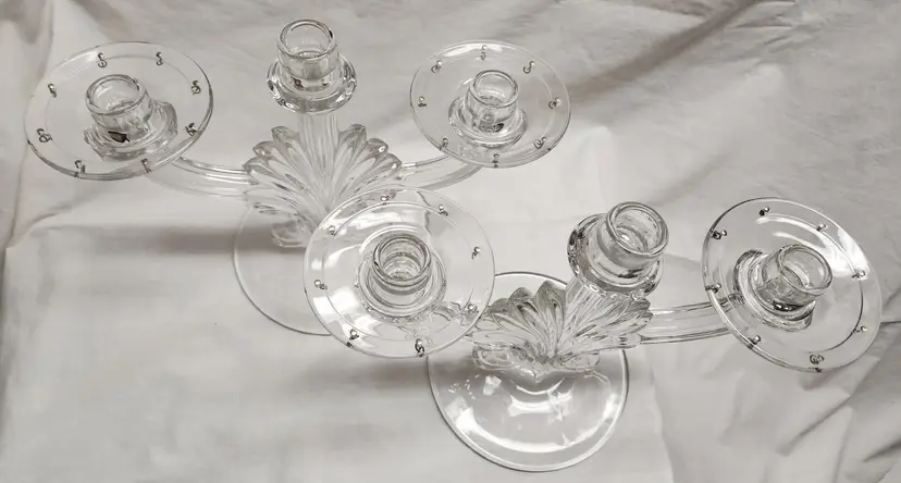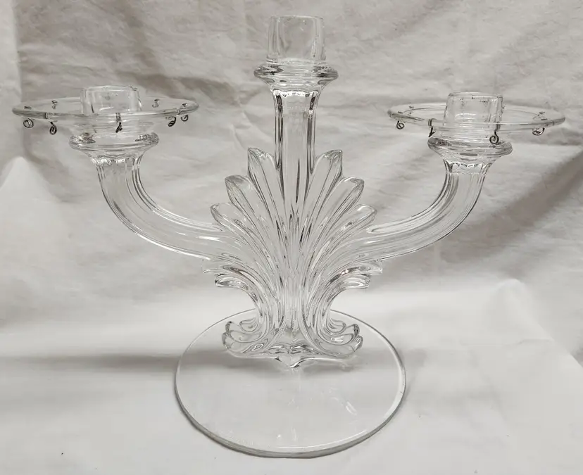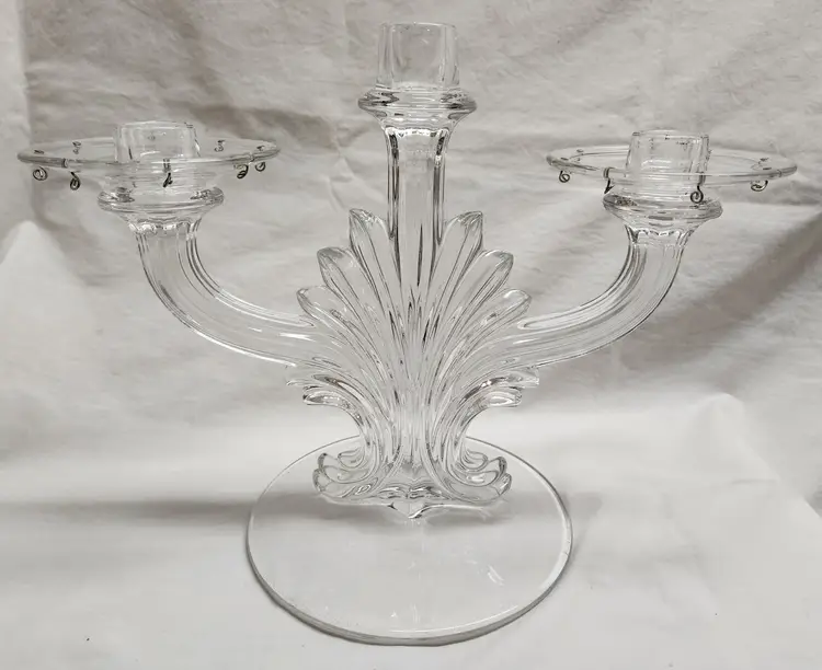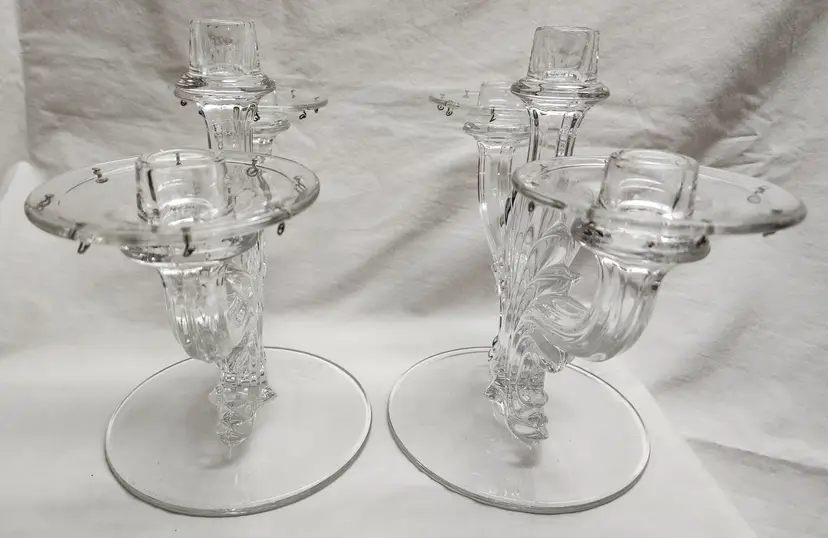 Set of 2, 1936-1966 Art Deco Fleur de Lis style, missing prisms and center bobeche 9 1/2" center height, 8" sides, 6 1/2" base width, 12 1/5" full width