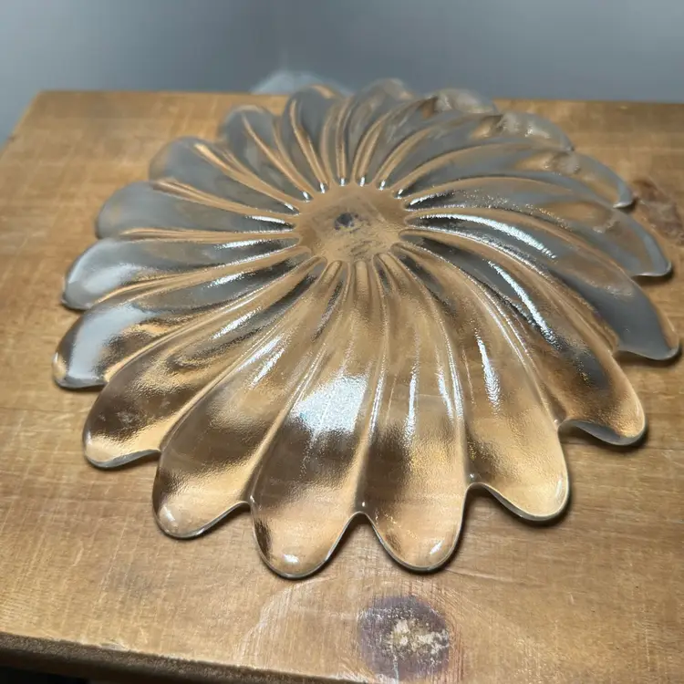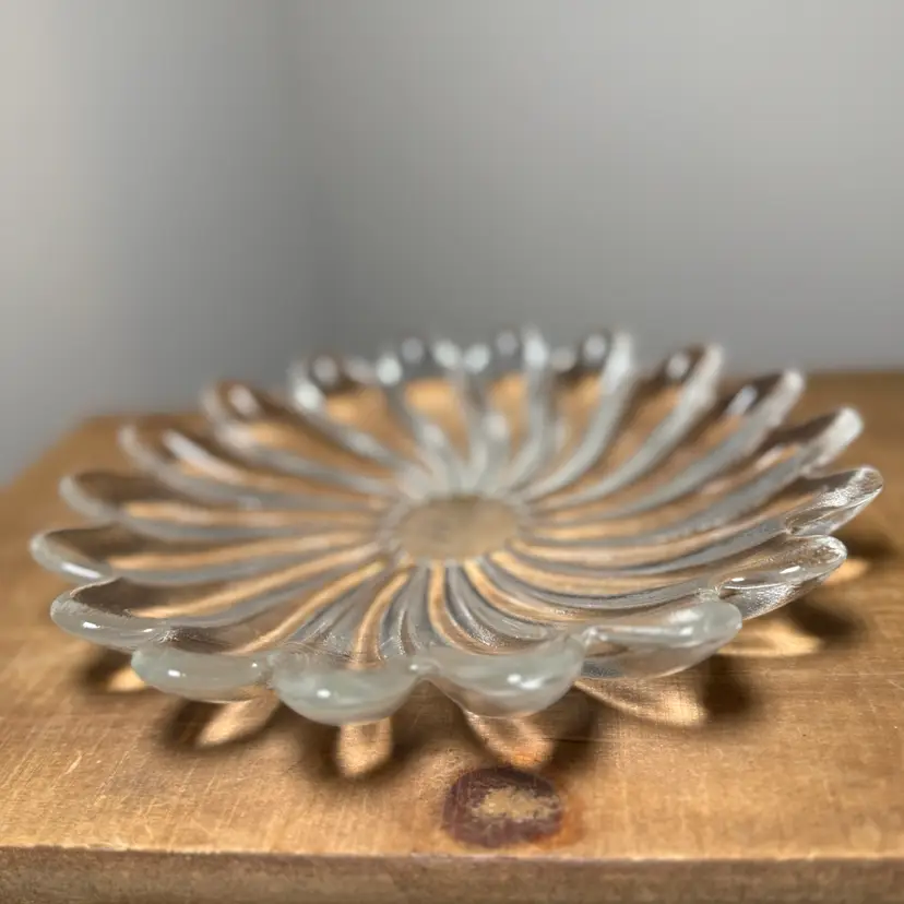 Vintage Fostoria Colony Swirl Pattern Petal Dish in clear pressed glass. This elegant piece features the iconic Mid-Century swirl design radiating from the center to form a scalloped, petal-like rim. This versatile dish is perfect for serving nuts, candies, or as a decorative trinket bowl.