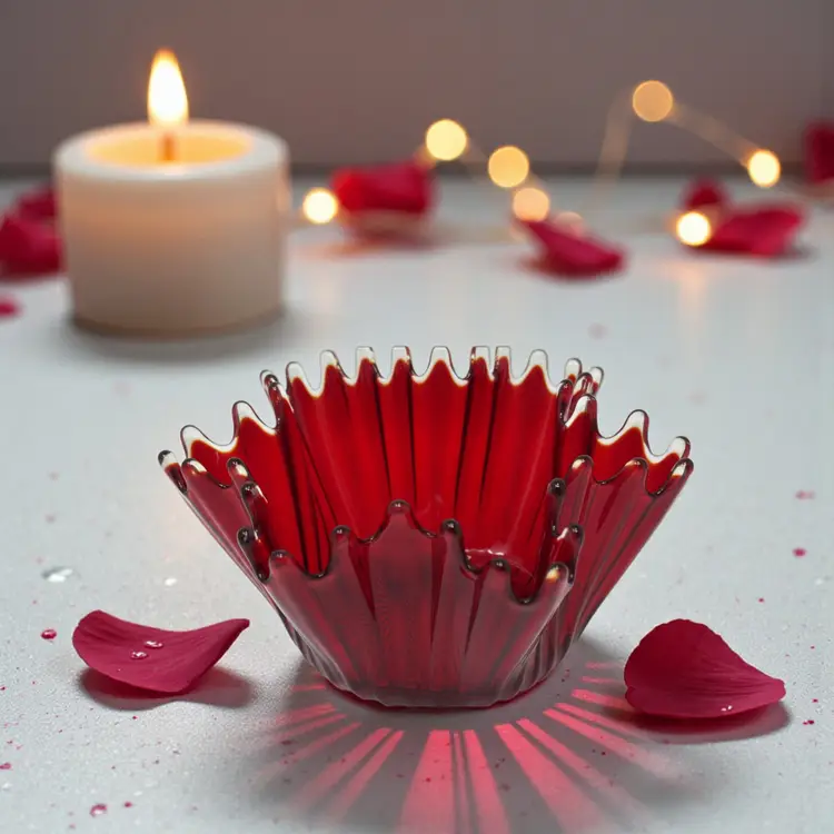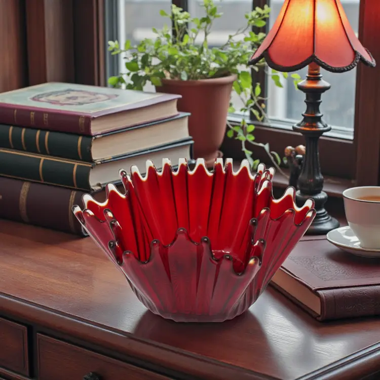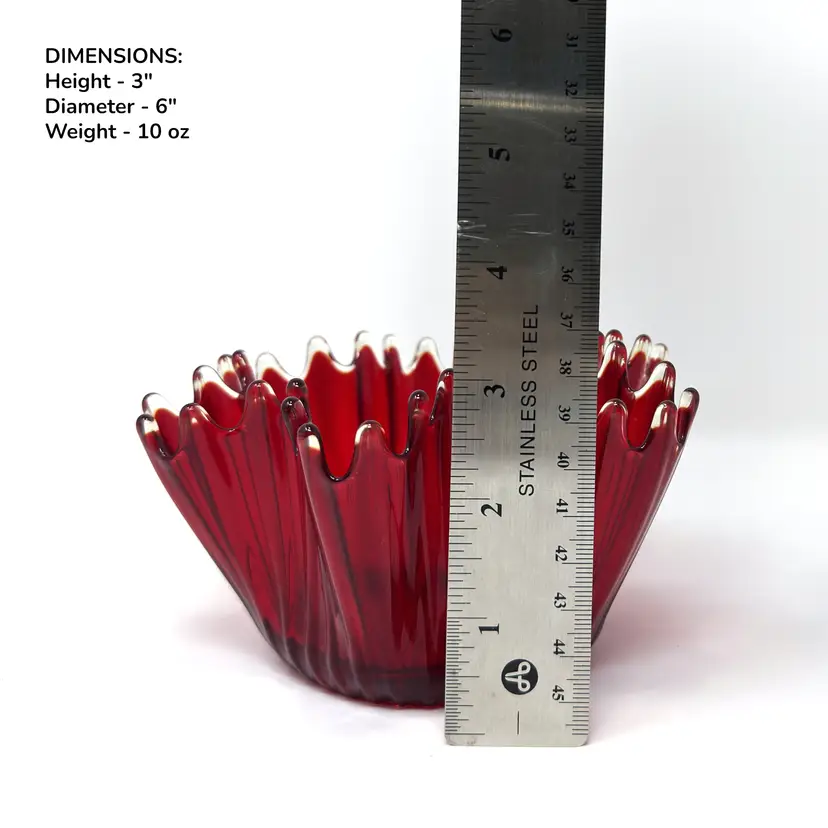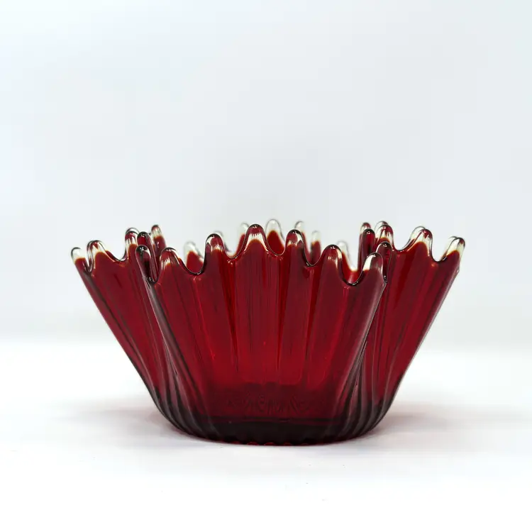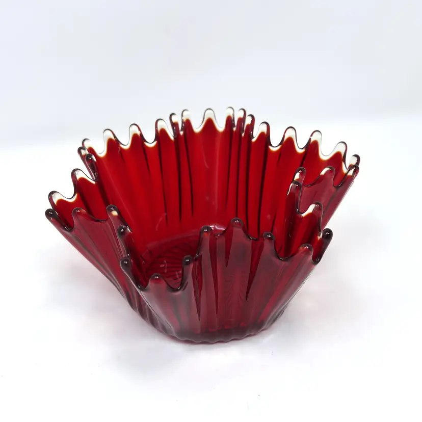 A striking piece for traditional and vintage collections, this bowl works beautifully as a candy dish, fruit bowl, or tabletop accent. The depth of the ruby tone and the clear‑tipped ruffled rim make it rich in visual character without overt ornamentation.