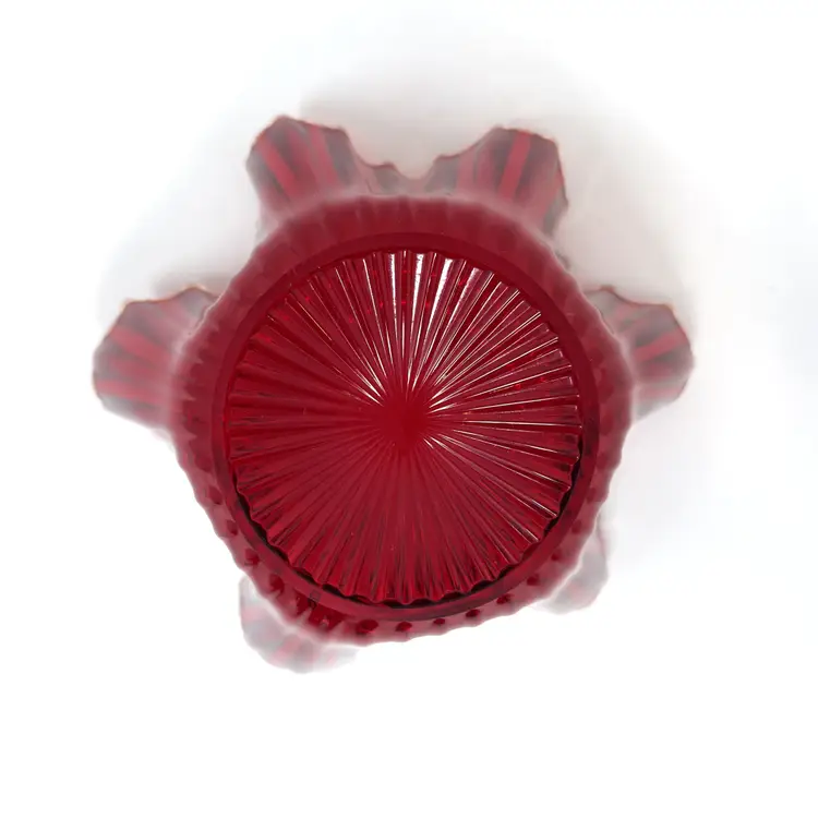 Details • Manufacturer (Attributed): Fostoria Glass Company, USA • Pattern/Style: Attributed Heirloom Ruby red glass style (unmarked) • Date/Era: Mid‑20th century (circa 1950s–1970s) • Design Style: Traditional, Vintage, Cottagecore • Shape & Highlights: Ruffled/handkerchief edge with clear tips, fluted body • Material & Color: Pressed glass — ruby red with clear edges • Dimensions: Diameter ~6″ × Height ~3″, Weight: ~10 oz