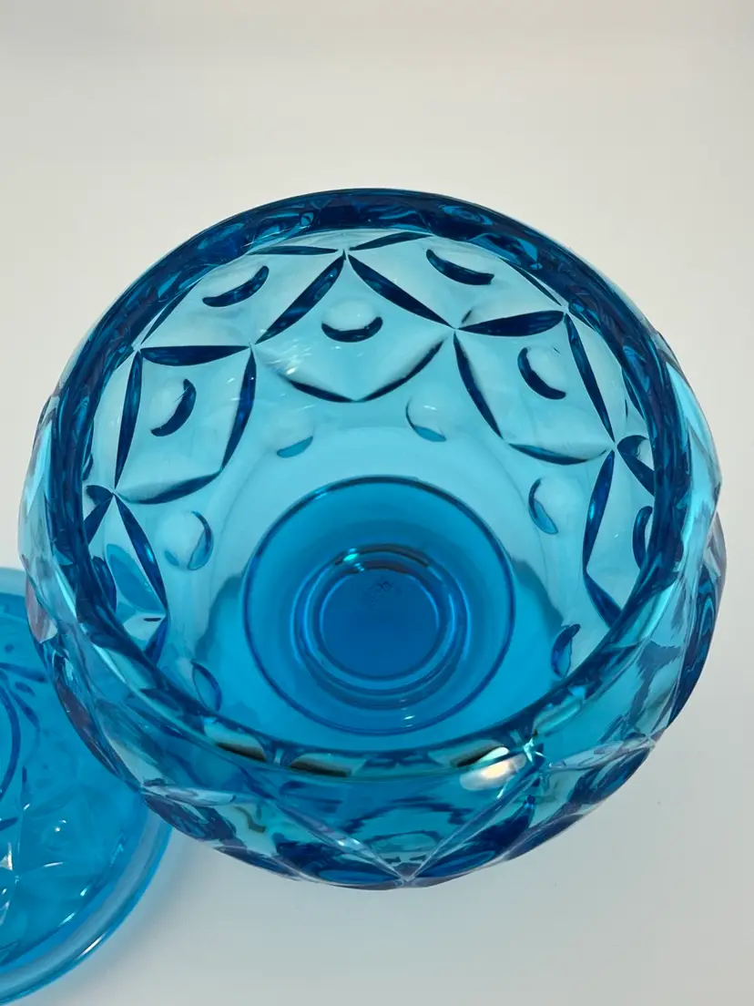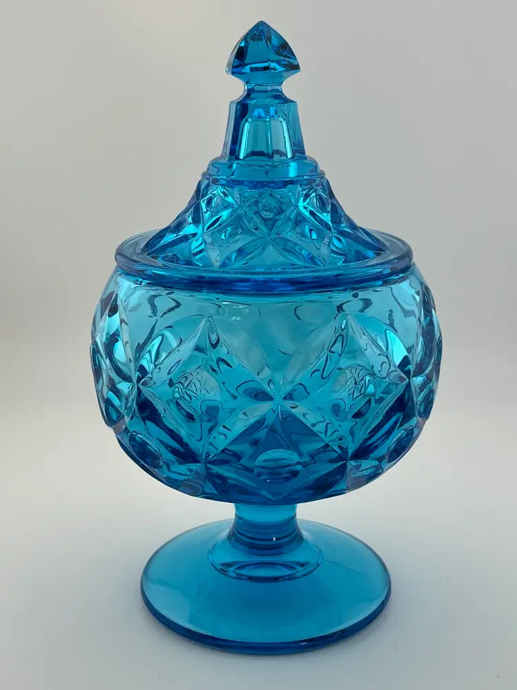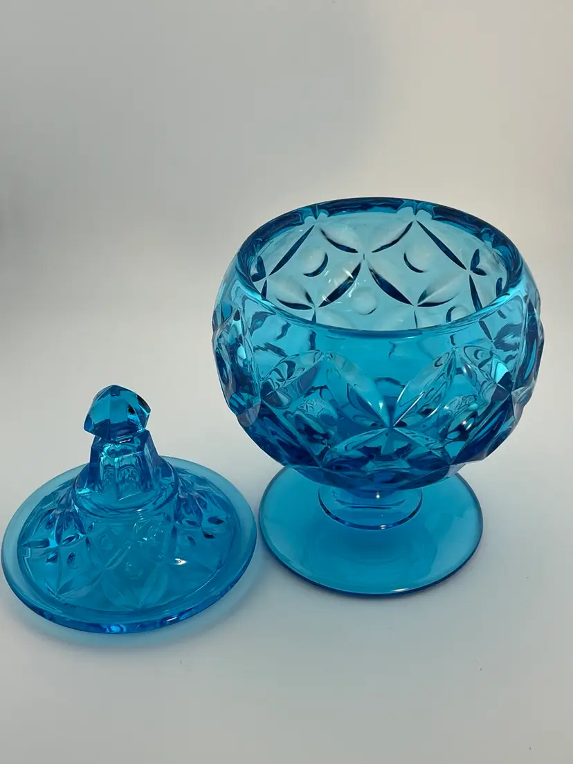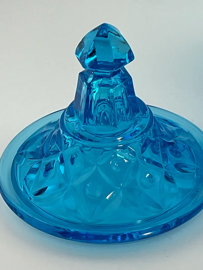 This is a beautiful blue covered candy dish by Fostoria, Henry Ford Museum. There is a chip on the lid rim.