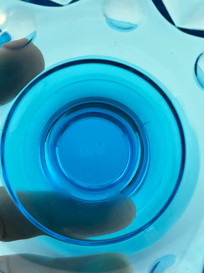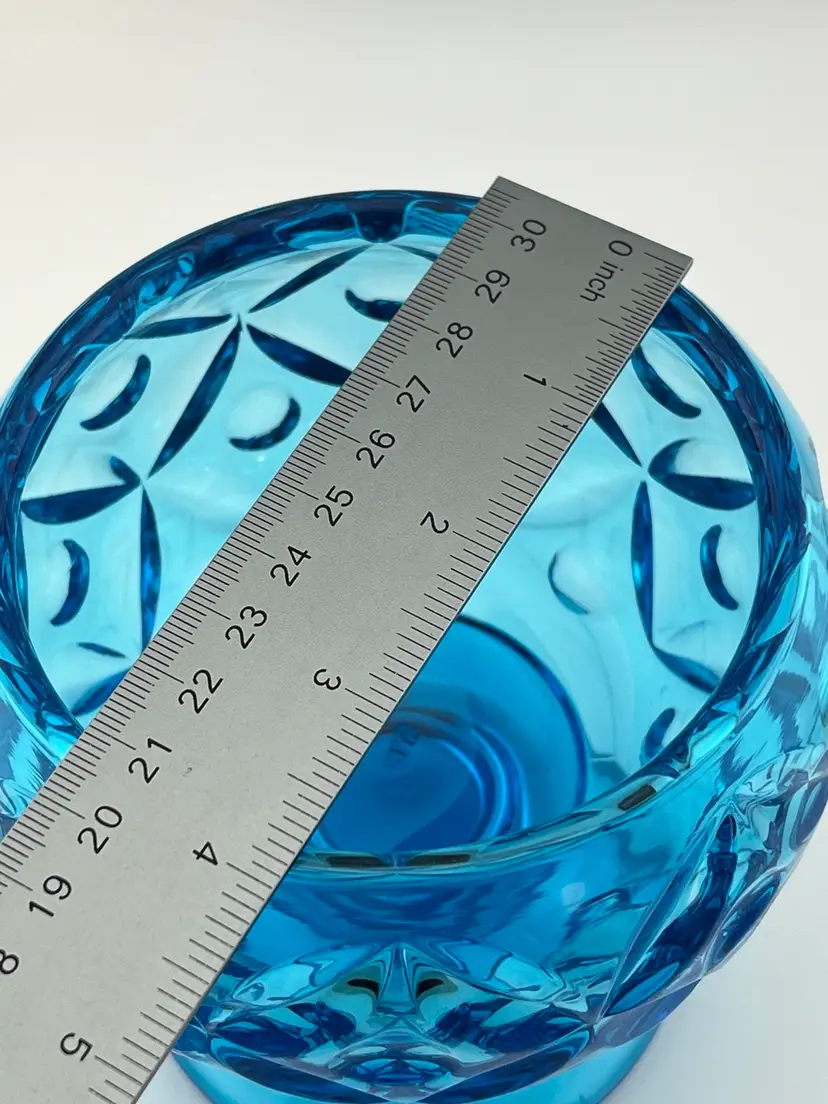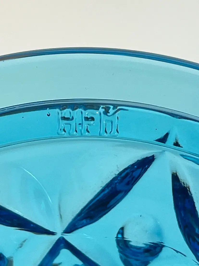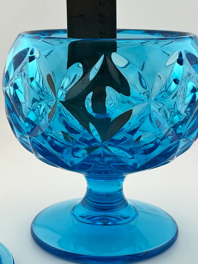 This is a beautiful blue covered candy dish by Fostoria, Henry Ford Museum. There is a chip on the lid rim.