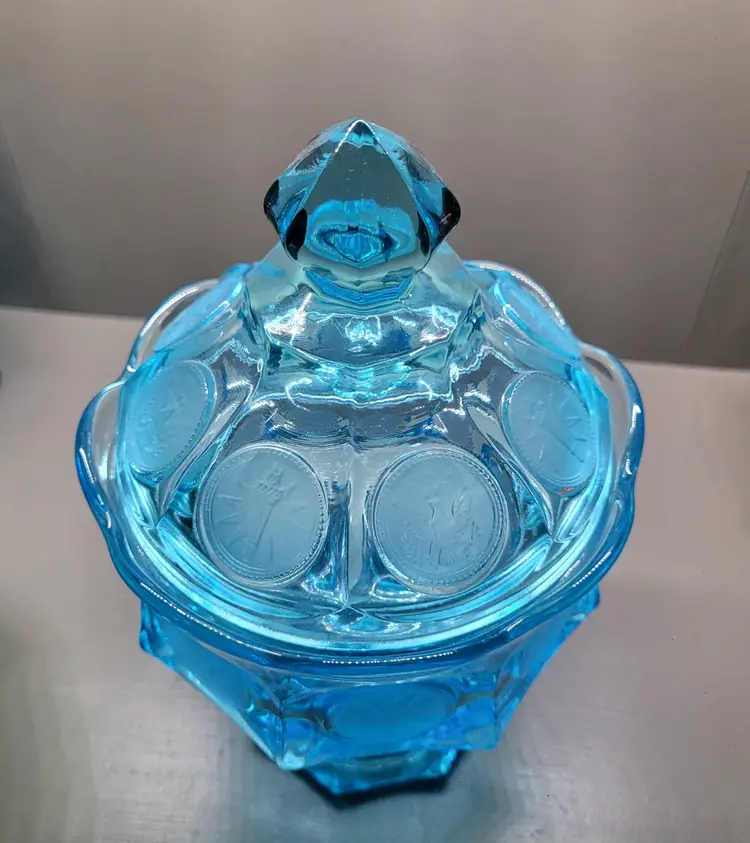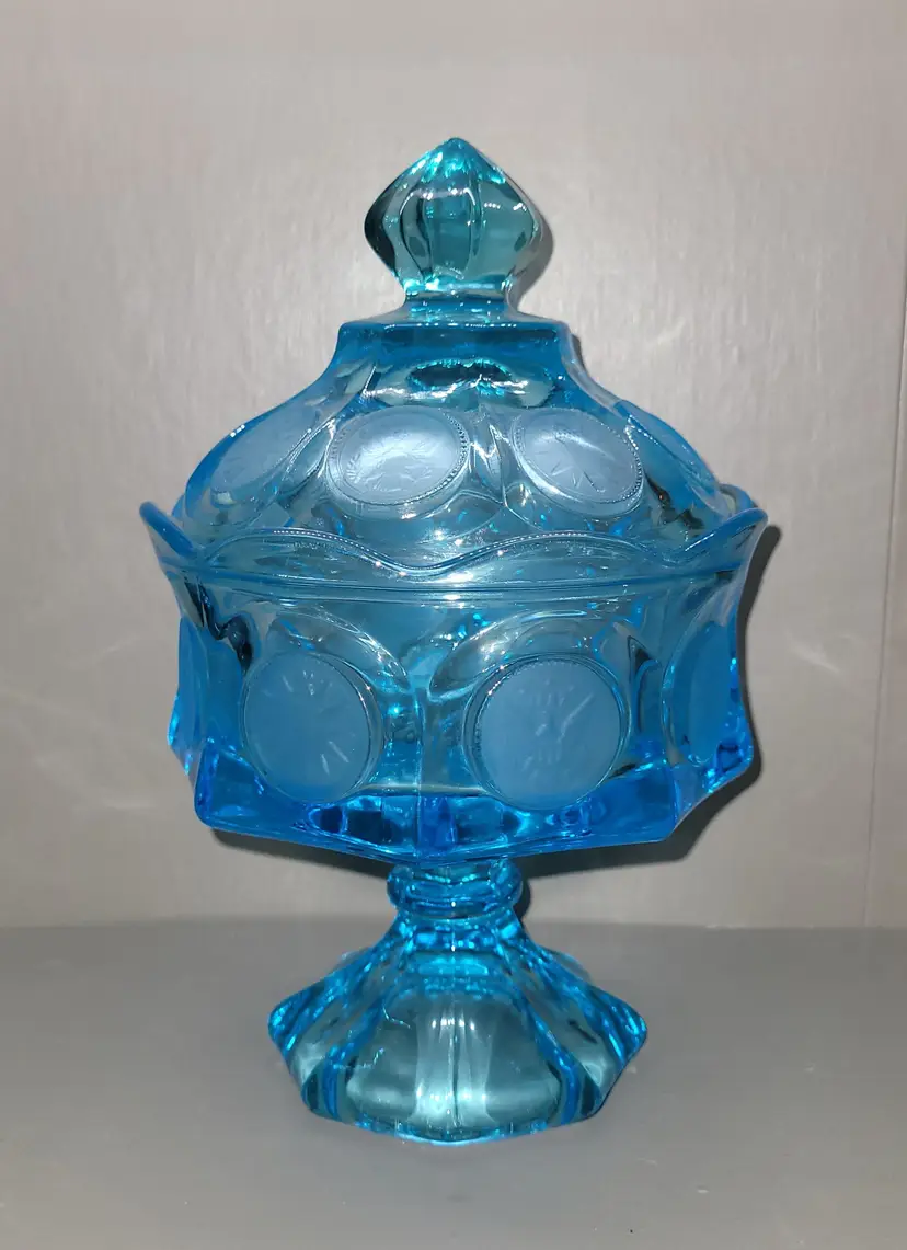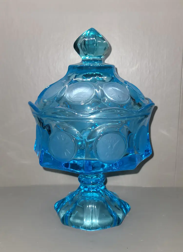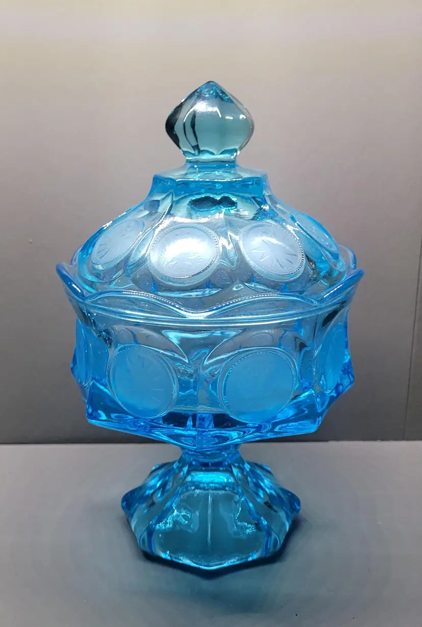 Beautiful lidded candy dish / compote / wedding box. Approximately 8.5" tall. No cracks or chips. Has maganese glow.