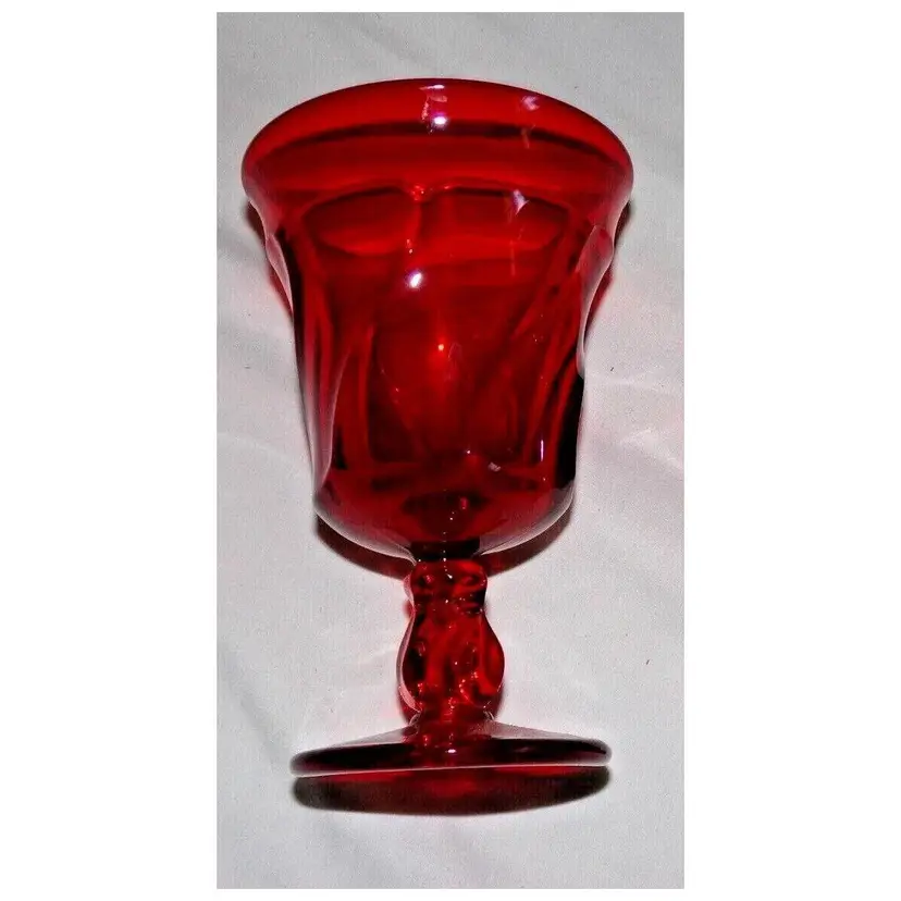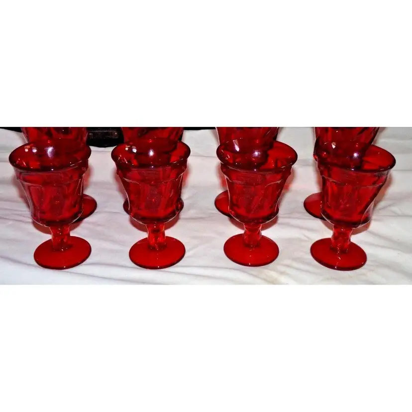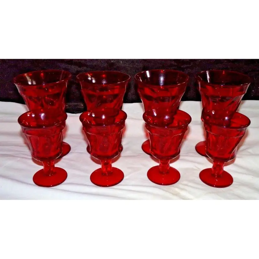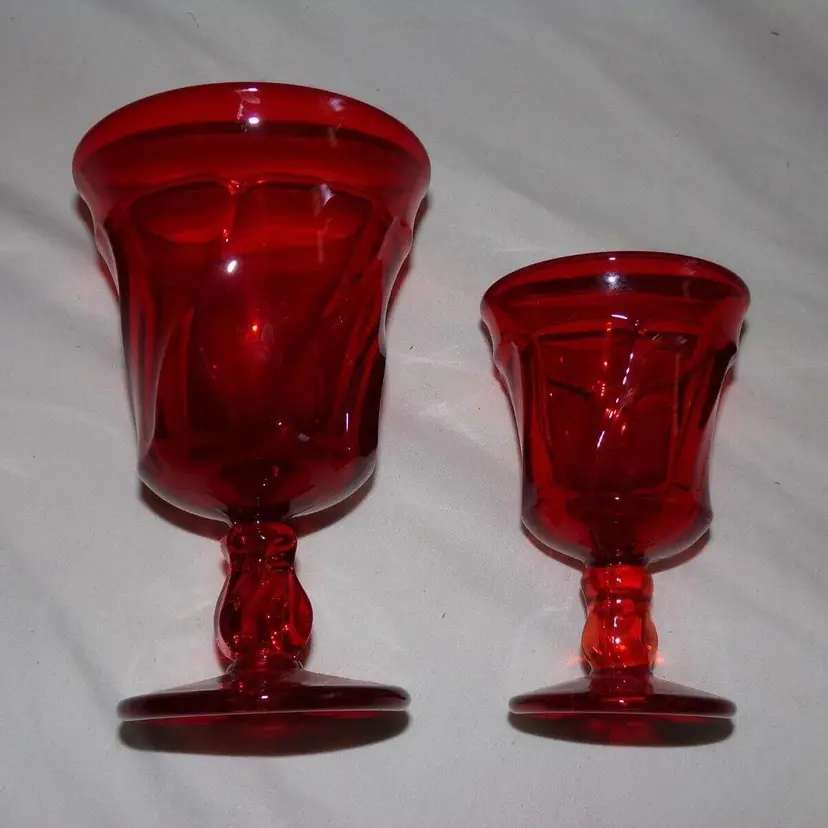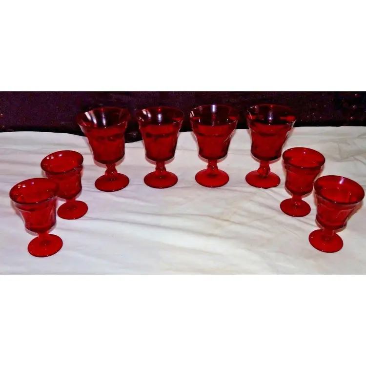 These are vintage MCM, Fostoria Glass JAMESTOWN Ruby Red Water Goblets and Wine Glasses. I have 4 of each size and they are being sold as sets of 4. Water Goblets are 5.7/8" high each and 4.0" diameter. Wine Glasses are 4.3/8" high each and 3.0" diameter.