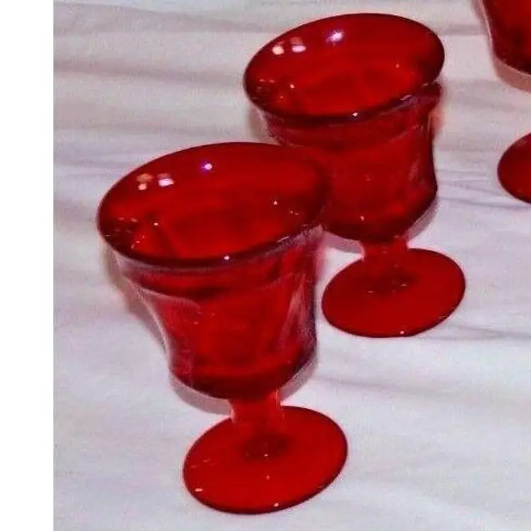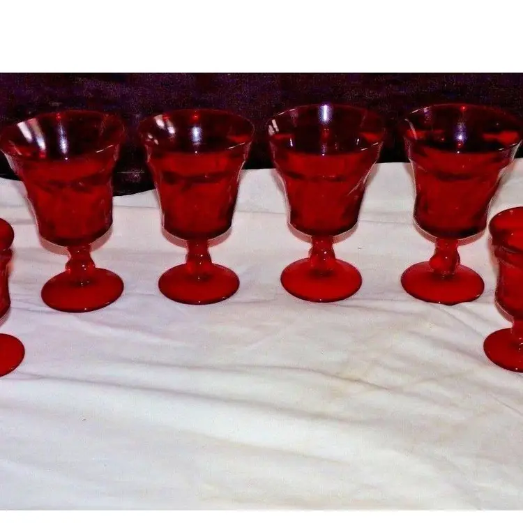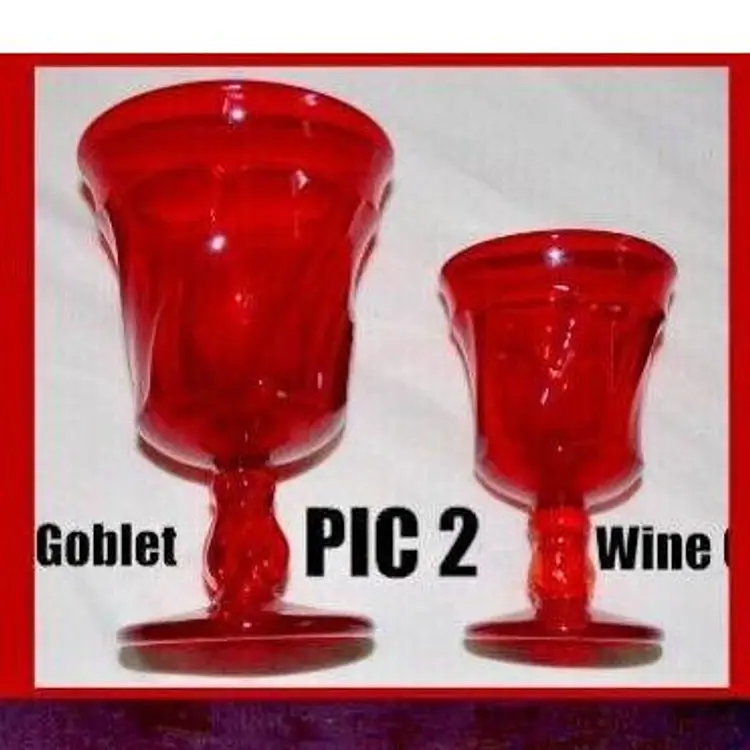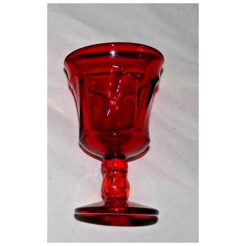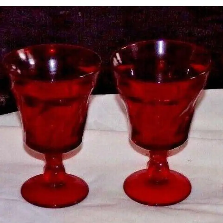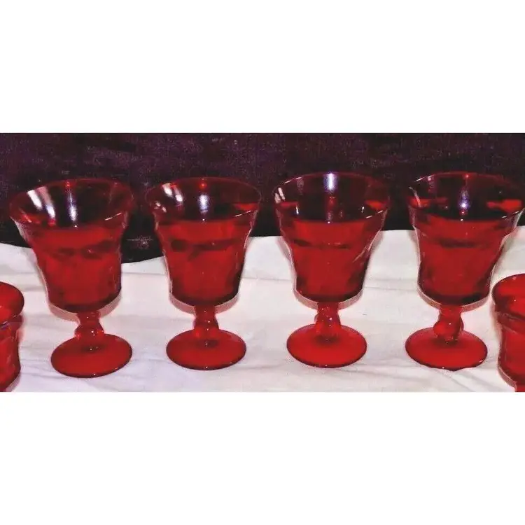 These are vintage MCM, Fostoria Glass JAMESTOWN Ruby Red Water Goblets and Wine Glasses. I have 4 of each size and they are being sold as sets of 4. Water Goblets are 5.7/8" high each and 4.0" diameter. Wine Glasses are 4.3/8" high each and 3.0" diameter.