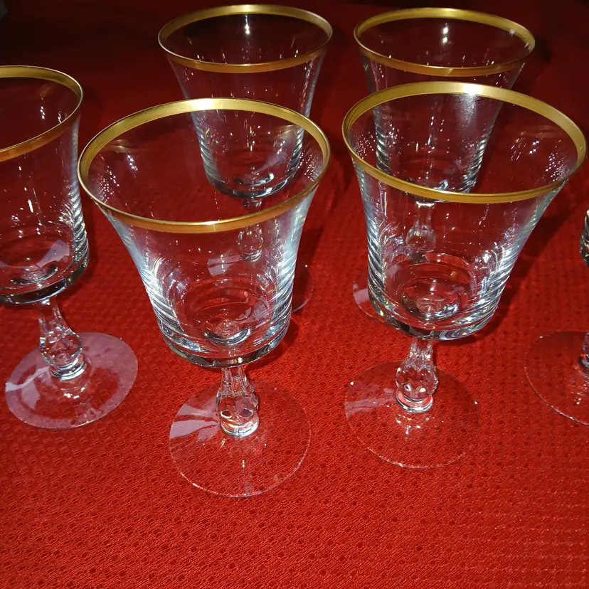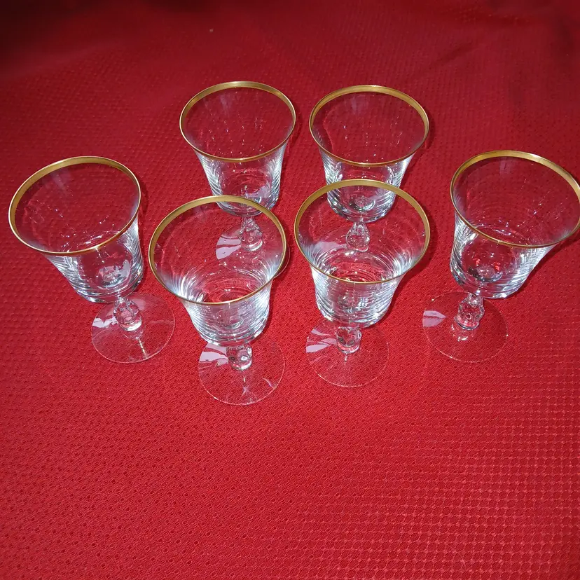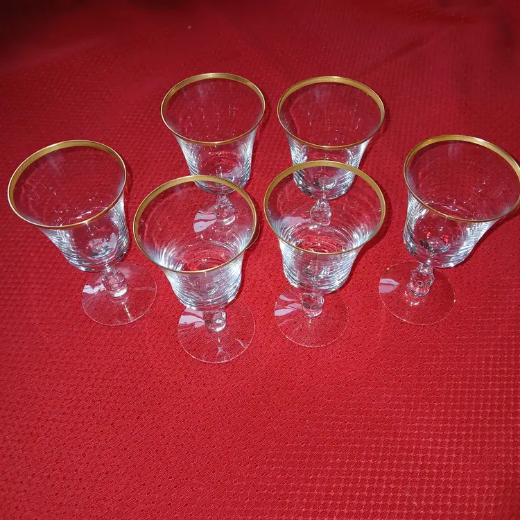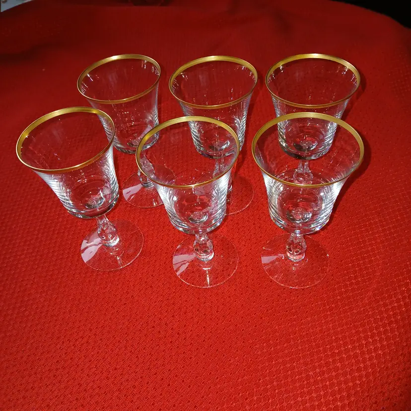 Set of 6 wine or water Goblets produced by Fostoria from 1961-1982 Elegant design with a gold rim, pristine condition. Would make a Beautiful addition to your Holiday Table.