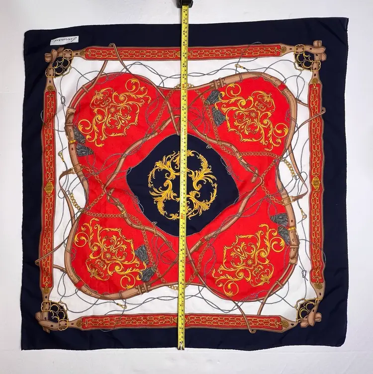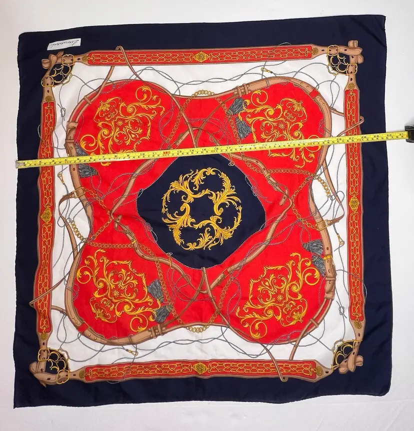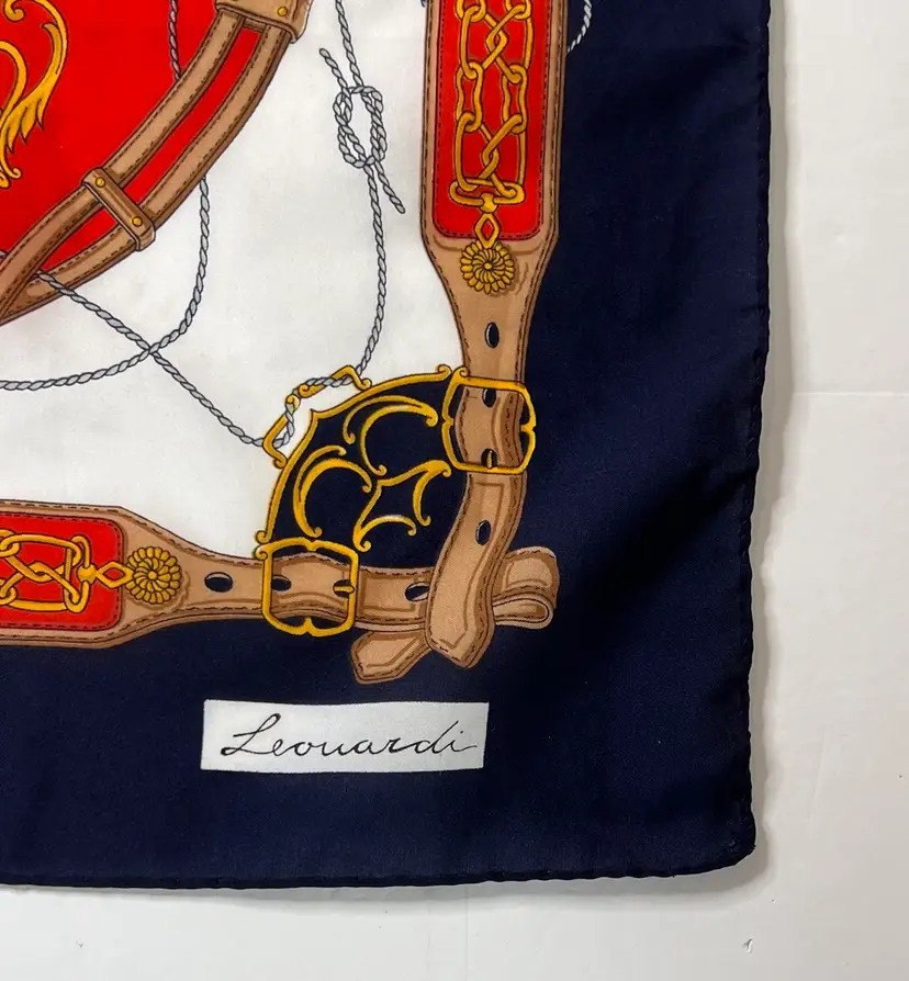 Foulard Leonardi Vintage Scarf Made in Italy Equestrian Chains Belts 30x30". Super fun! Red, White and blue Equestrian style scarf. Made in Italy. 100% Polyester. Item in excellent gently used condition. No known rips, tears, holes, stains or defects. Colorful, Retro, Italian, Accessory, 60s.