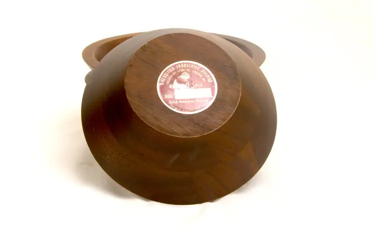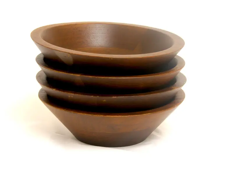 This is a set of four solid walnut bowls made in Lebanon, Missouri by Diversified Industries Division of Independent Stave Company.