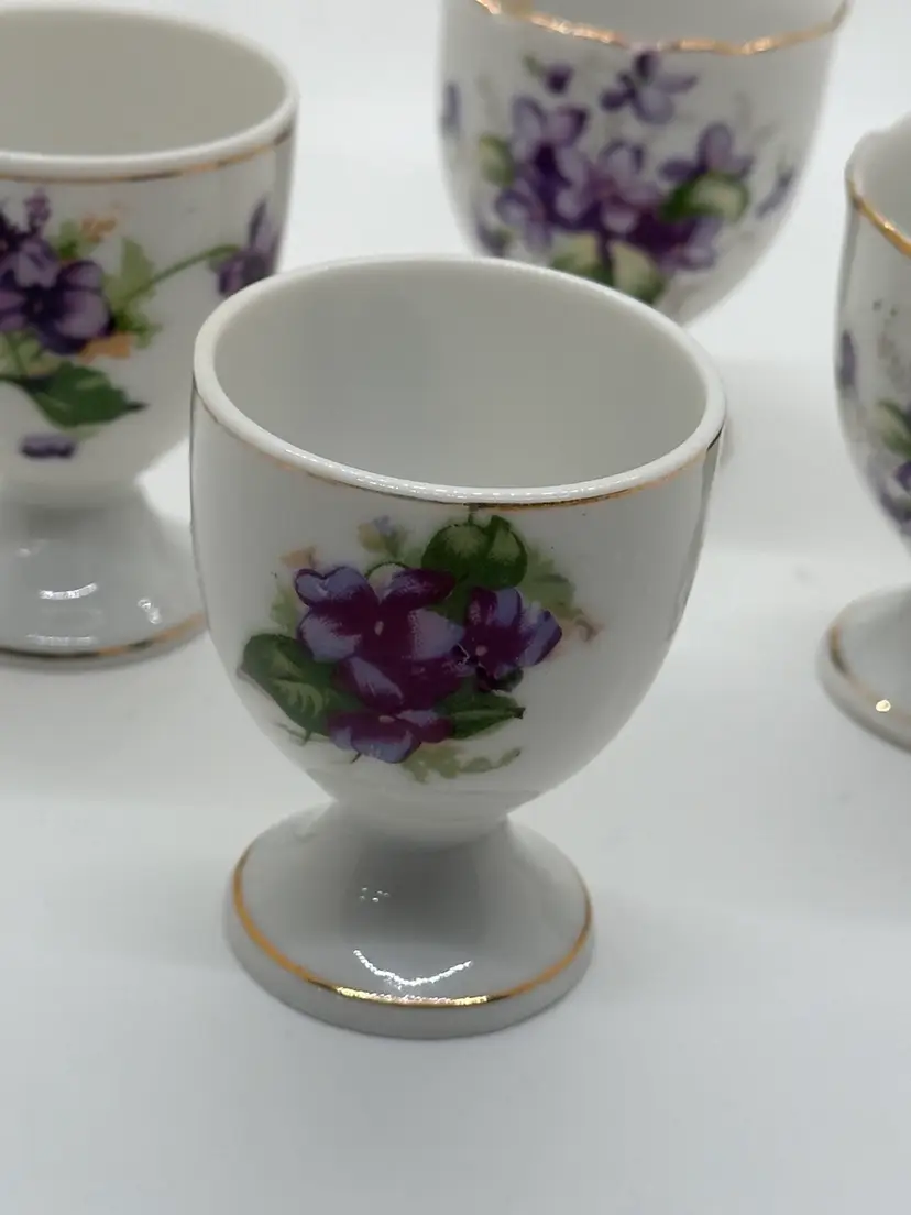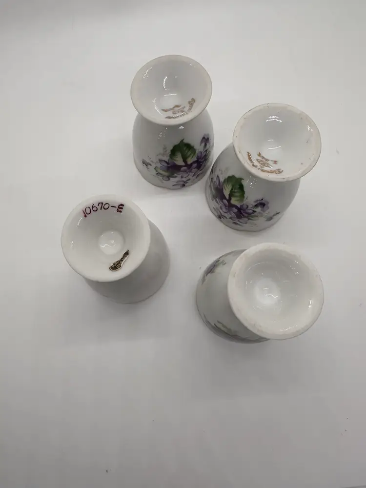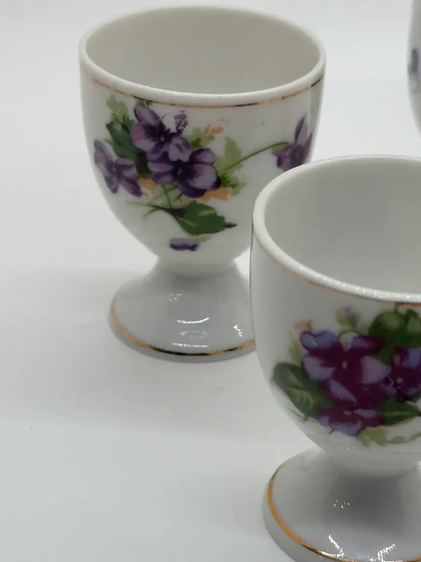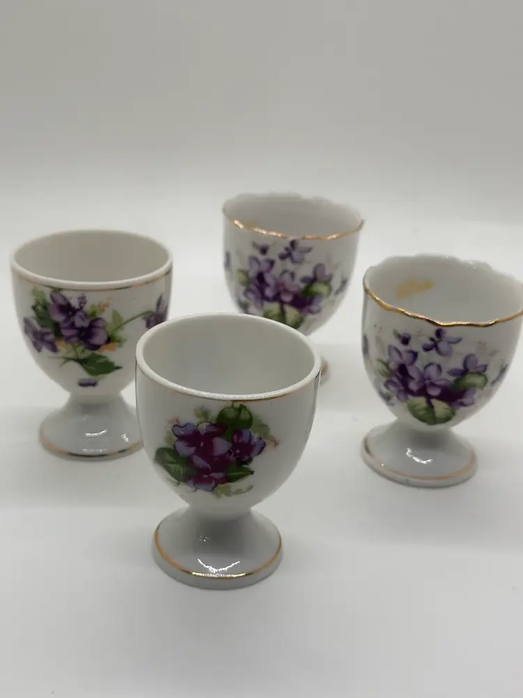 Four bone China egg cups on a pedestal, trimmed in gold. Two of the egg cups have scalloped edges. Different violet designs on each. They stand 2 1/2 inches tall. No chips or cracks. Japan. Some wear in the gold