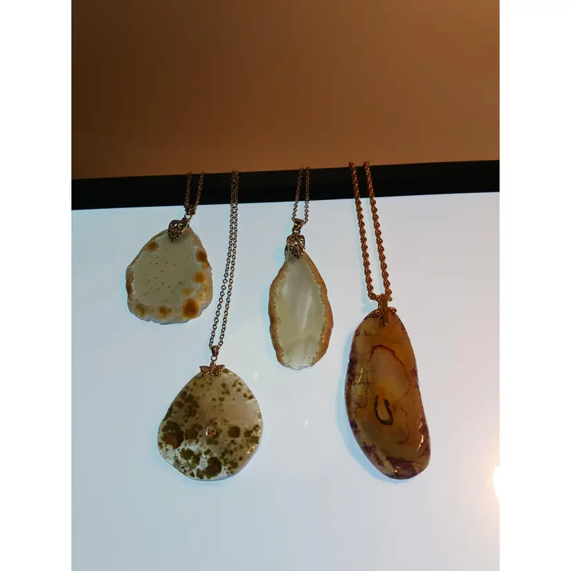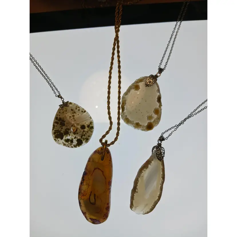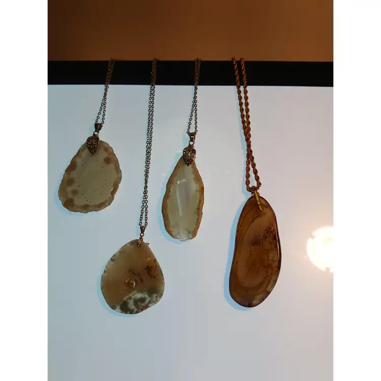 Natural Agate Slice Gemstone that measure 1 1/2 x 2 x 3/16 inches is suspended from a Stainless Steel chain that can be worn at 19, 20, 21, 22 and 23 inches