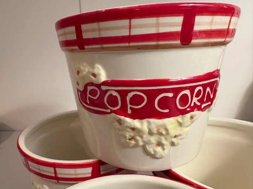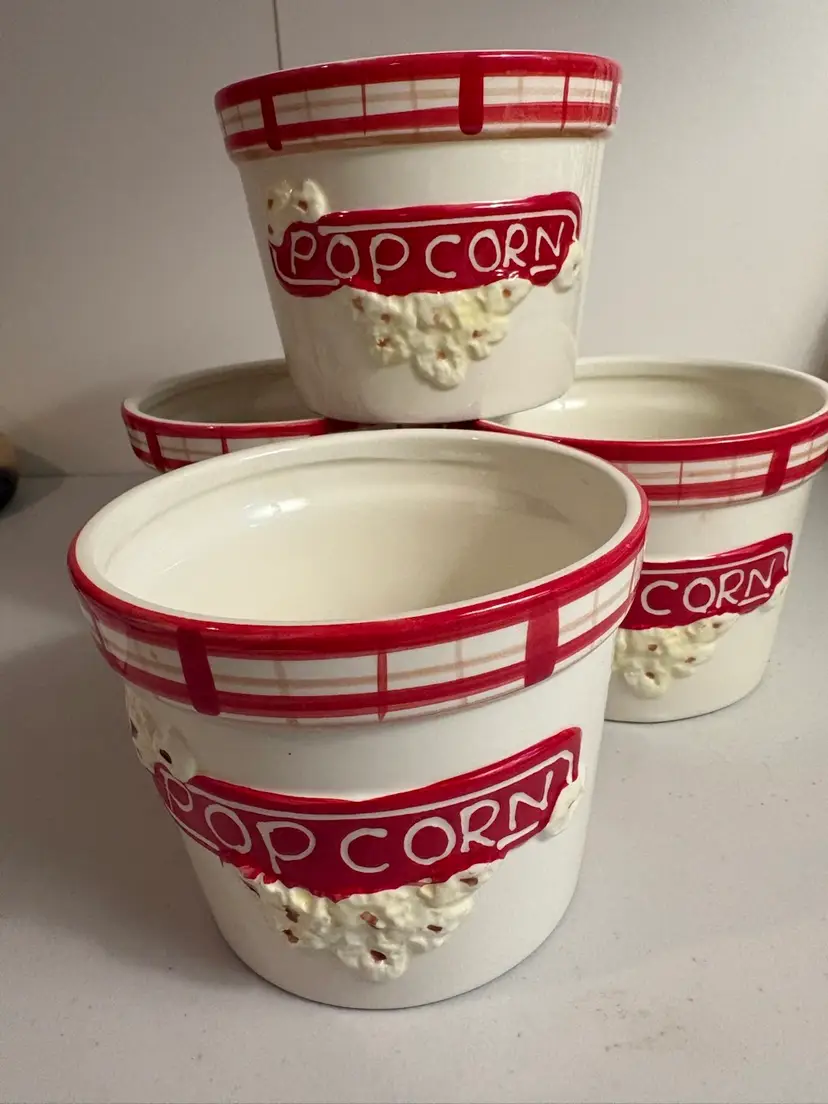 The product is a set of four individual ceramic popcorn bowls in a red and ivory color scheme. Each bowl features a popcorn pattern, perfect for serving popcorn or other snacks during movie nights or gatherings. Made of durable ceramic material, these bowls are both stylish and practical for any home kitchen or dining area. Ideal for entertaining guests or everyday use, these popcorn bowls add a fun and whimsical touch to your table setting.