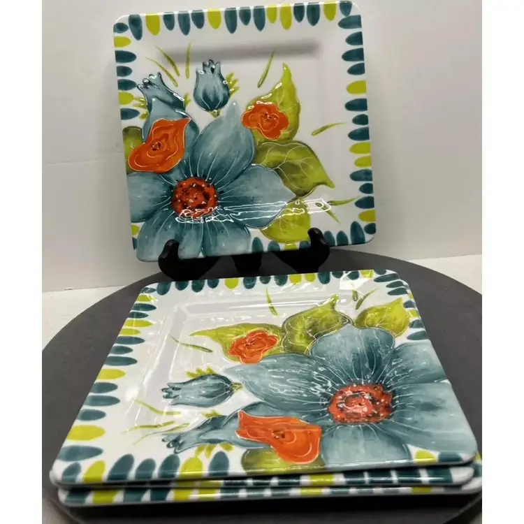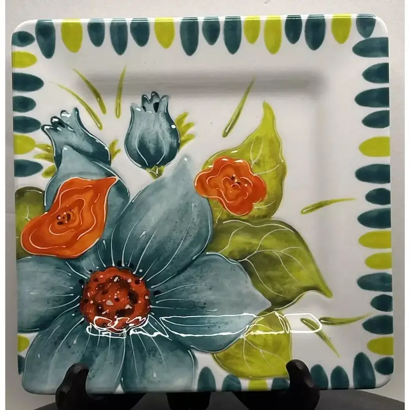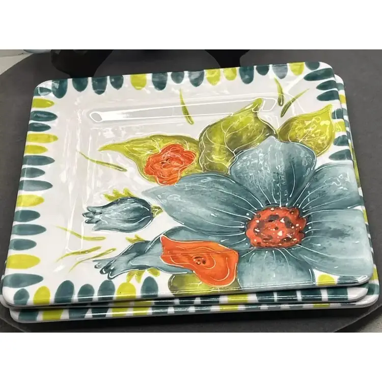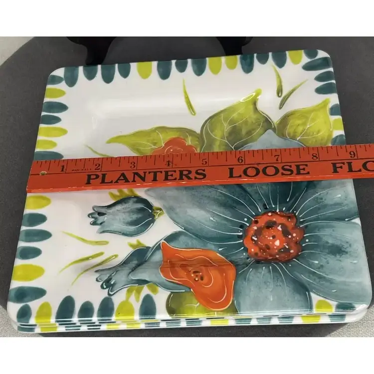 This set of four Laurie Gates square melamine salad plates feature a colorful large flower pattern in blue, green, and orange on a white background. These beautiful and bold melamine salad or luncheon plates will make a splash on your next get together. Each squre plate measures 9" inches in length and width, and are very lightweight.