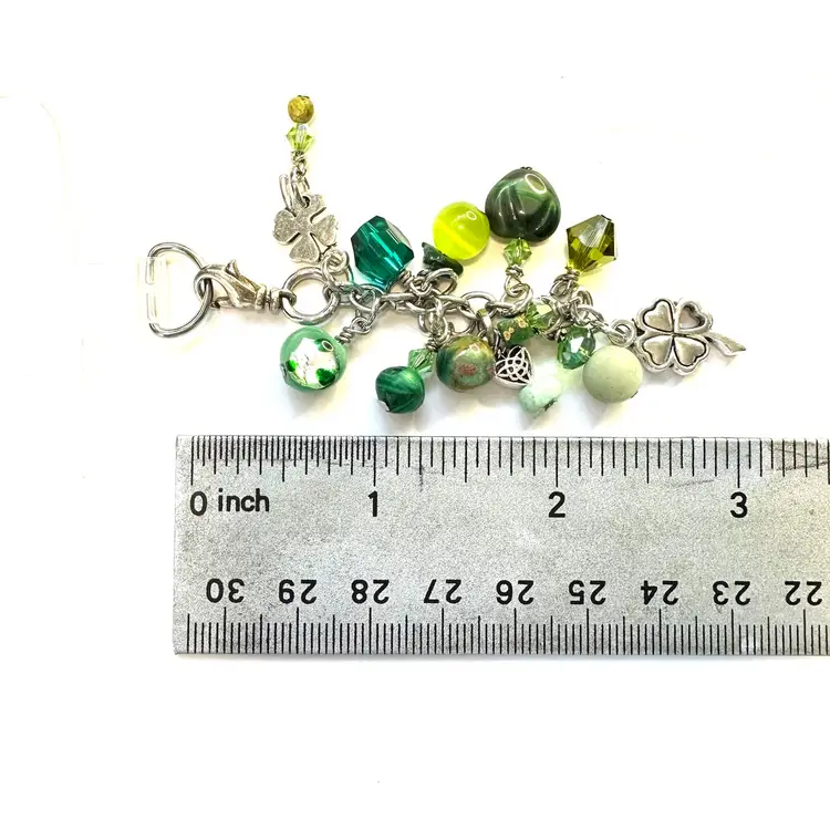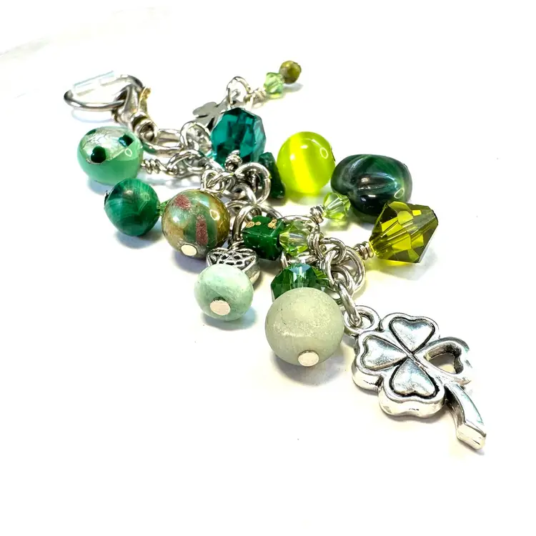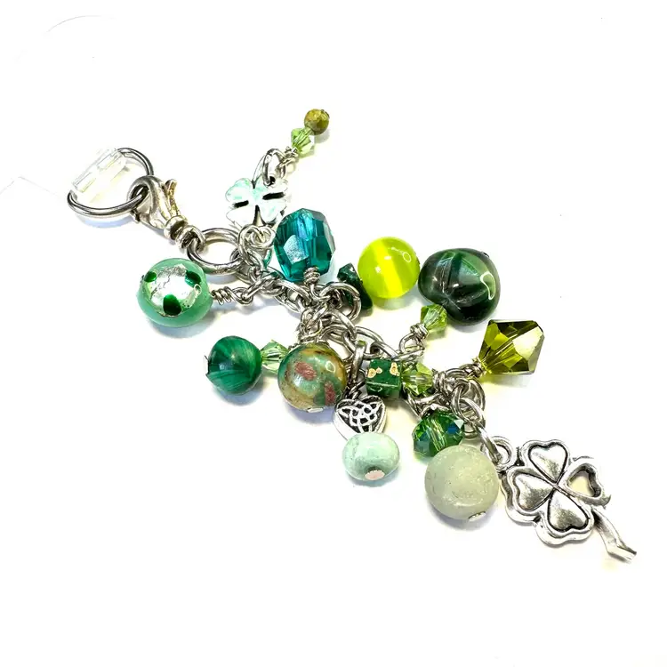 Features two four leaf clover charms, other various shades of green beads made of glass and stone and a small metal Celtic knot bead Silver tone findings Cell phone charm holder which fits between the phone and the case Also includes a swivel hook for optional use as a purse charm Lobster clasp allows for quick and easy removal when needed without removing case Made by me with repurposed jewelry pieces