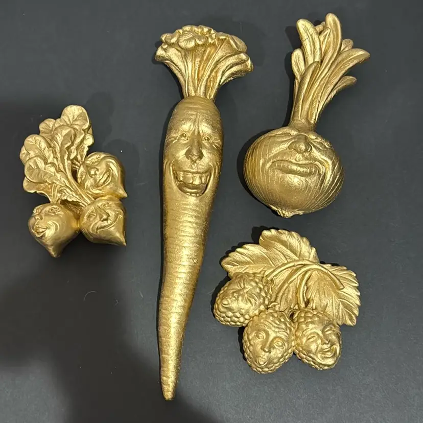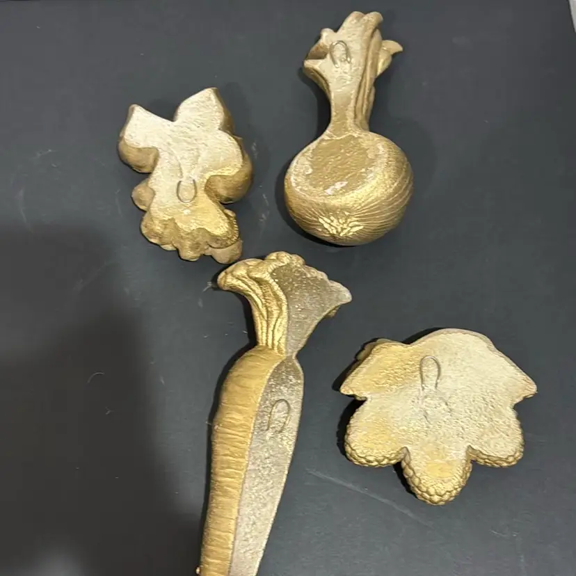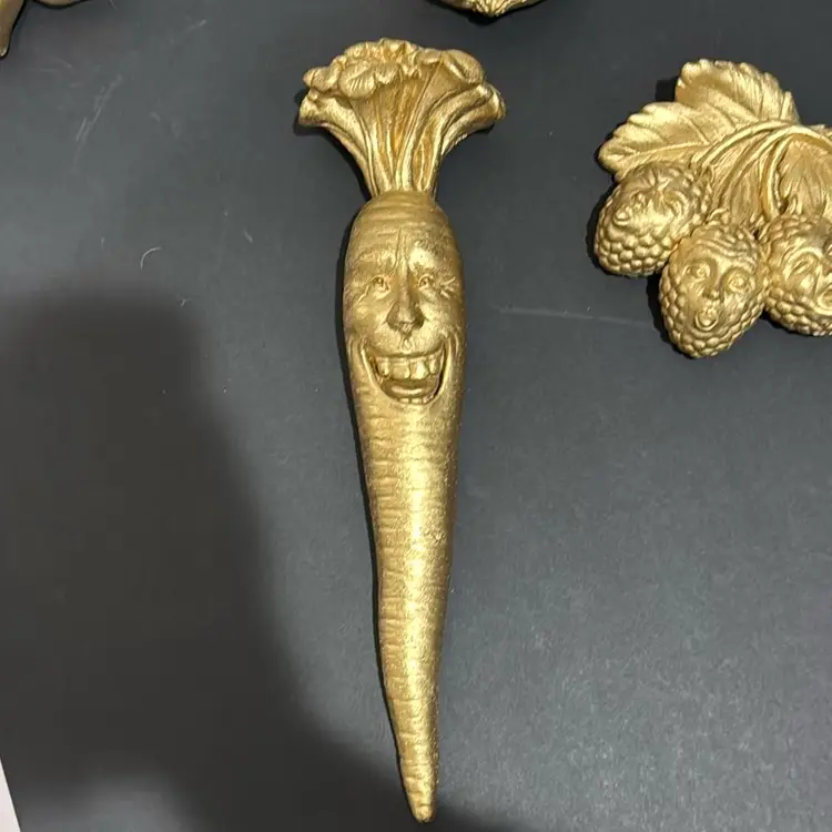 Super cute four piece set of wall hanging character vegetables. Carrot measures about 13 inches. Onion measures about 8 inches and does have a repair. Radishes measure about 5 inches long and berries measure about 5 inches also. These look really good hanging in your kitchen. If you're only interested in one, please let me know!
