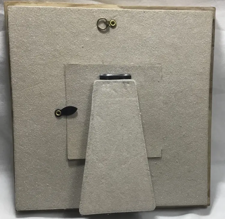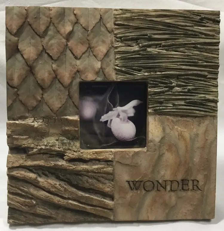 7.5 inches square textured polystone (resin mixed with powdered stone) frame. 4 different textures, leaves, pine needles, tree bark and stone, each texture takes up 1/4 of the frame. Can be hung on a wall or sit freely. Back has fabric overlay. Picture opening in back is 3.5 inches square, but viewing window is 2.5 inches square. Has the word "WONDER" inscribed on the front. See all photos.