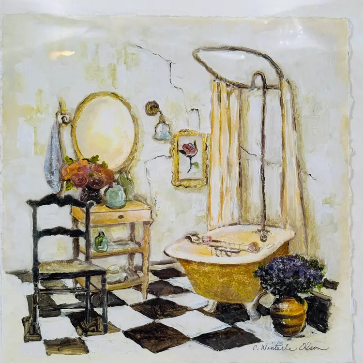 Features: This painting by C. Winterle Olson depicts a cozy, vintage bathroom with warm, muted tones. Key elements include a golden clawfoot tub, a wooden vanity with an oval mirror, a black chair, a checkered tile floor, and floral accents.