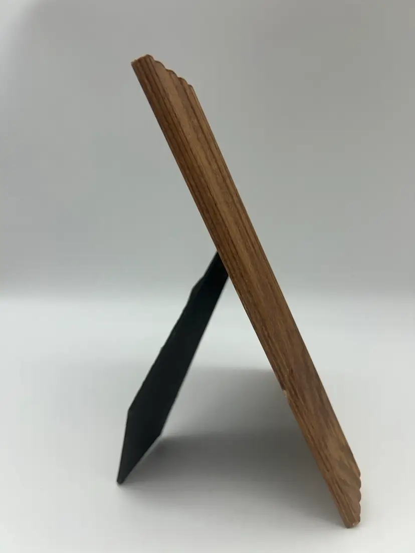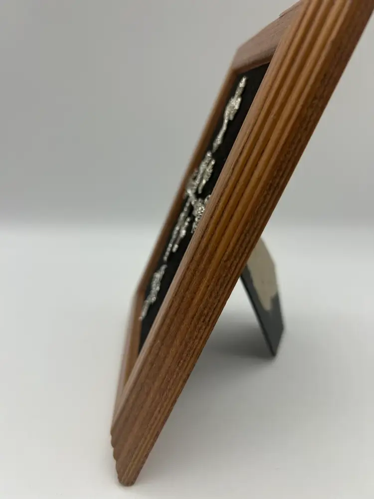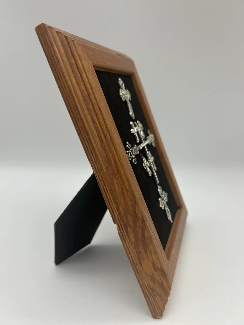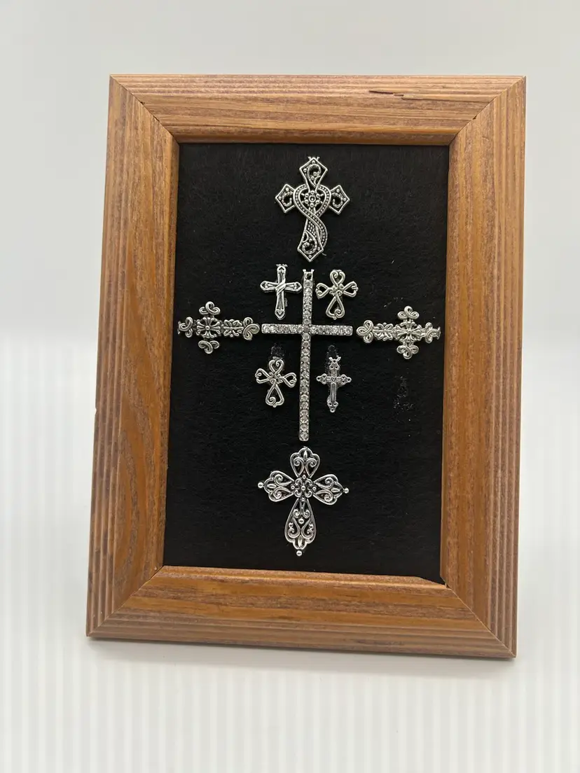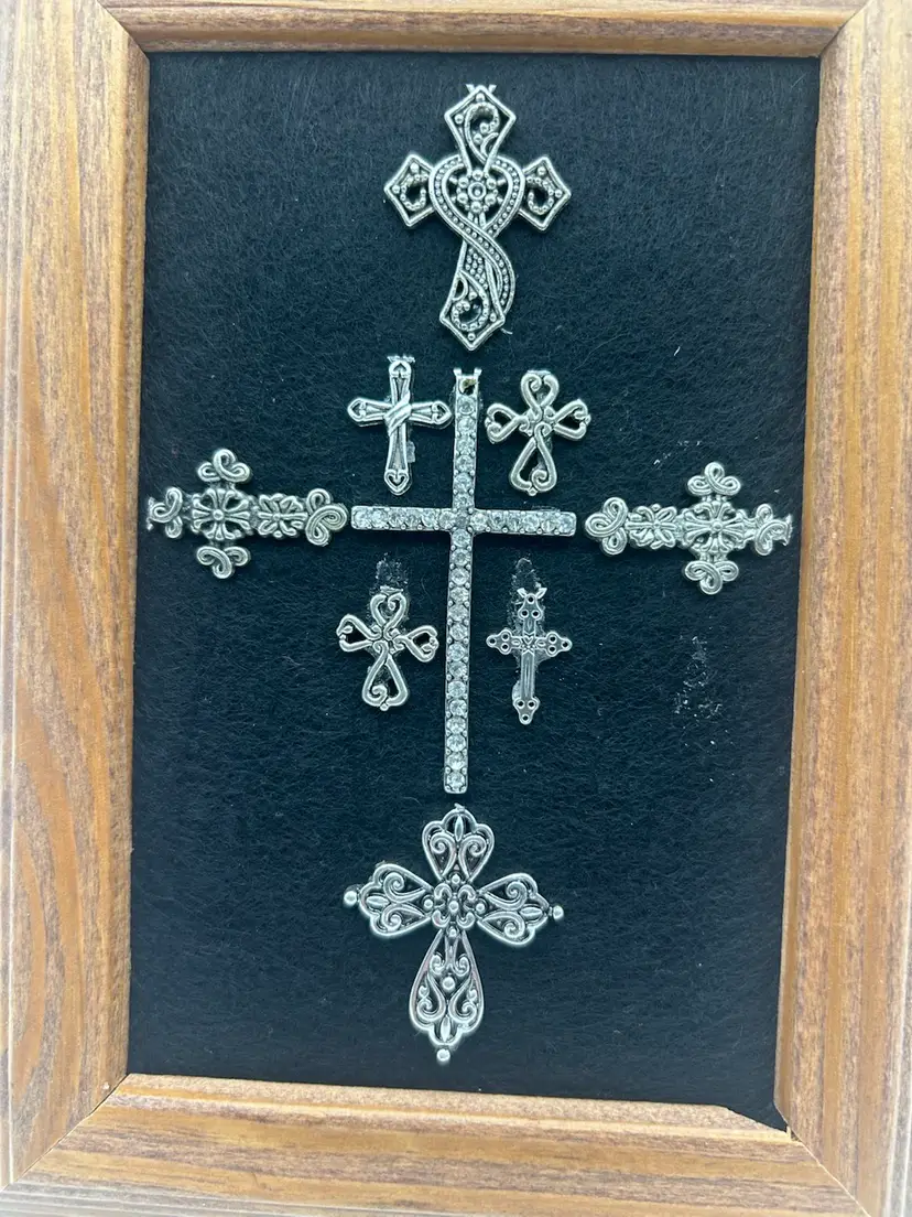 I repurposed the frame by adding the black felt to the glass. I then took some jewelry crosses and added them to create a cross. The frame measures approximately 8” tall by 5 1/2” wide.