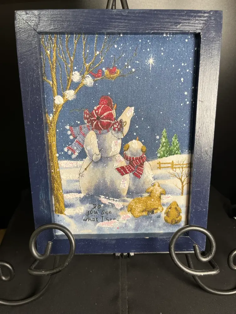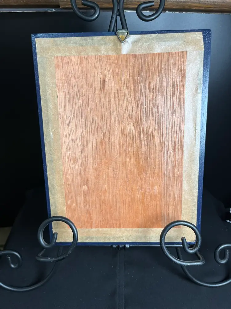 Hand crafted Denim on wood, w/ wooden frame. Simple but cute. It is in good condition. It measures approx 6" x 8", 1/2" Deep, 3.2 Oz