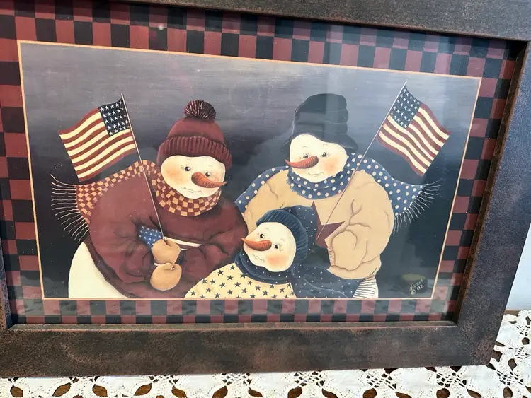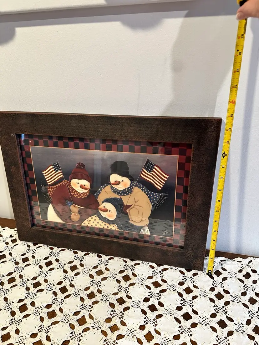 Framed Folk Art primitive picture of a Patriotic snowman family Approx 20”x15