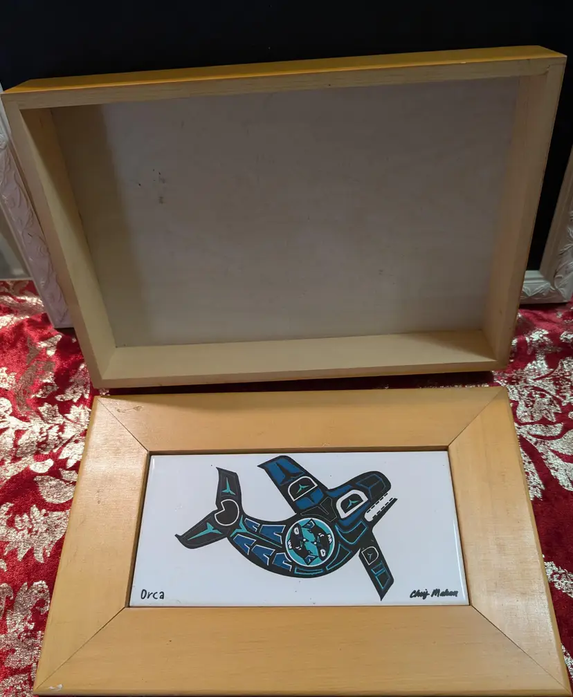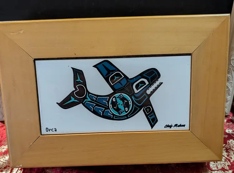 Beautifully Wooden Box featuring an orca whale in a striking Indigenous style. This piece showcases intricate patterns and vibrant colors, capturing the spirit of the ocean. Perfect for adding a touch of cultural elegance to any room. The frame measures approximately 11 inches length by 8 inches width with a approximately 2 inch depth. A unique addition to any art collection. Piece is used but is in Excellent condition with no cracks or chips, but does have a small scratch and does make piece AS IS but is still a great looking functional piece.