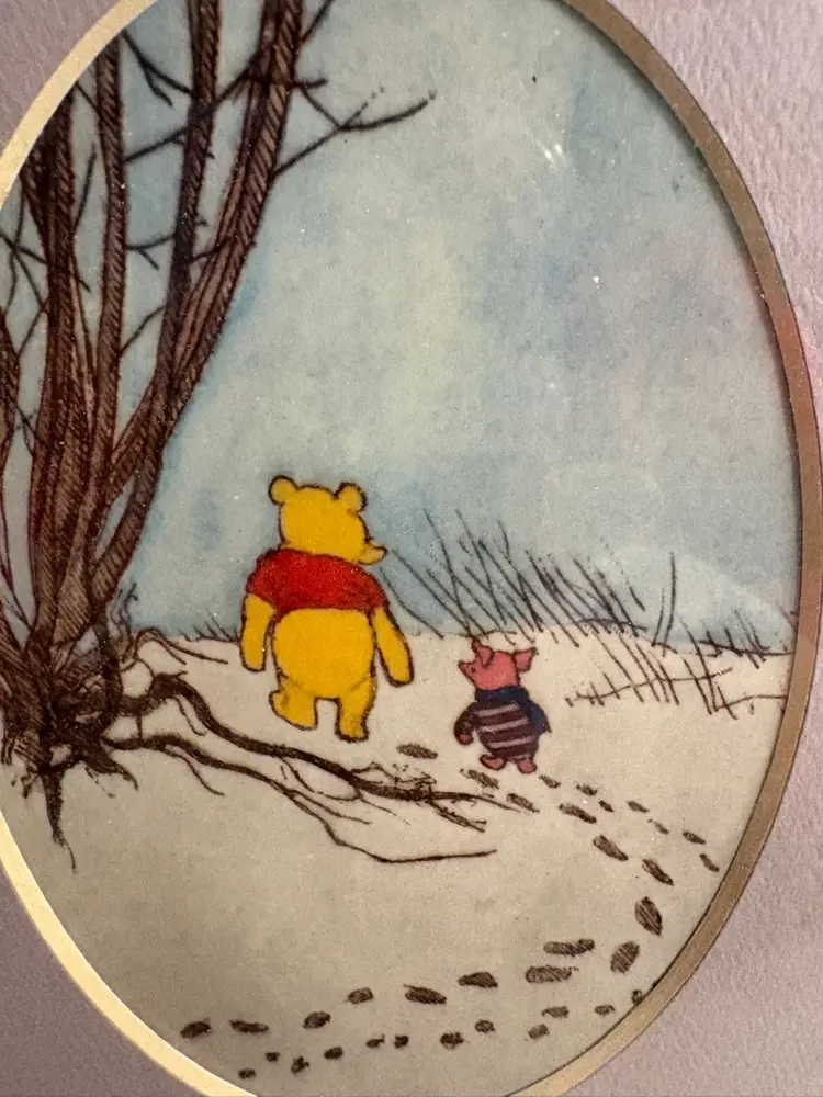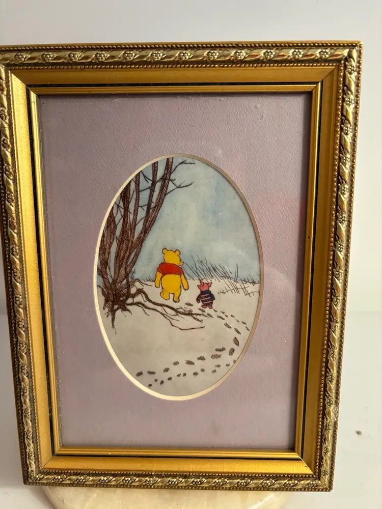 The print is a reproduction of an illustration by E.H. Shepard, who created the original drawings for A.A. Milne's Winnie-the-Pooh books. The art print is set in a decorative, ornate gold frame with a lavender-colored matting.