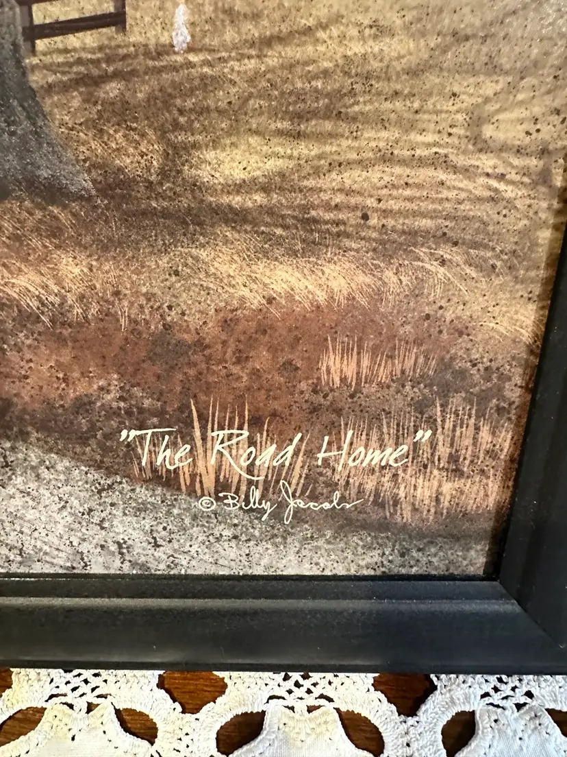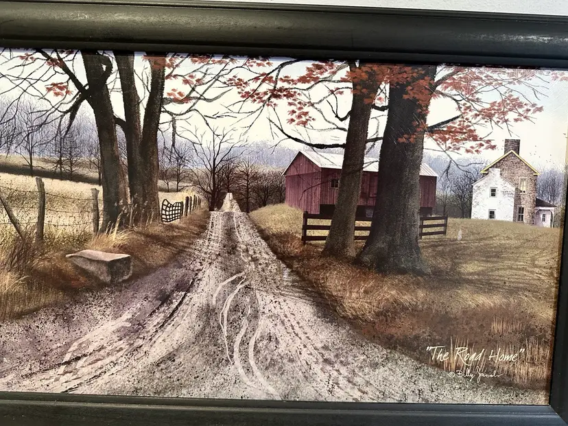 Billy Jacobs. The artwork depicts a country landscape with a dirt road leading toward a red barn and a white farmhouse. Approx. 22”x 15” Excellent condition