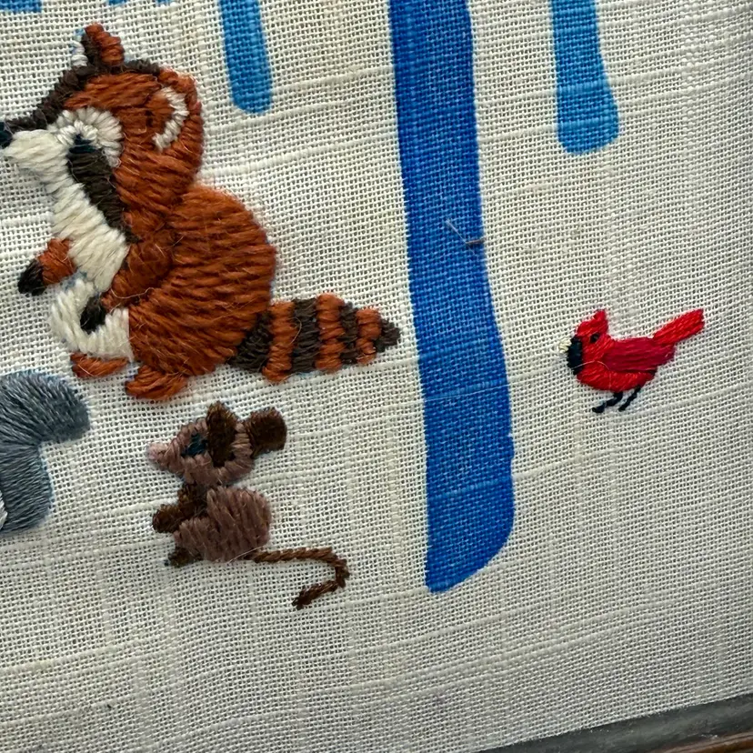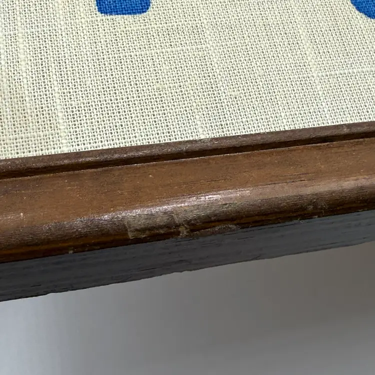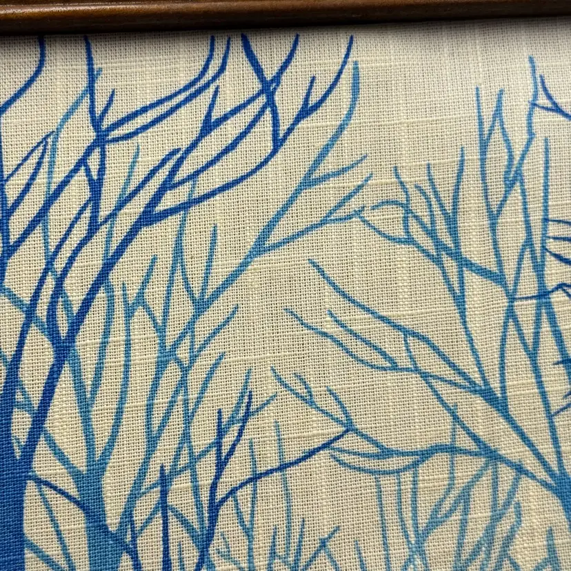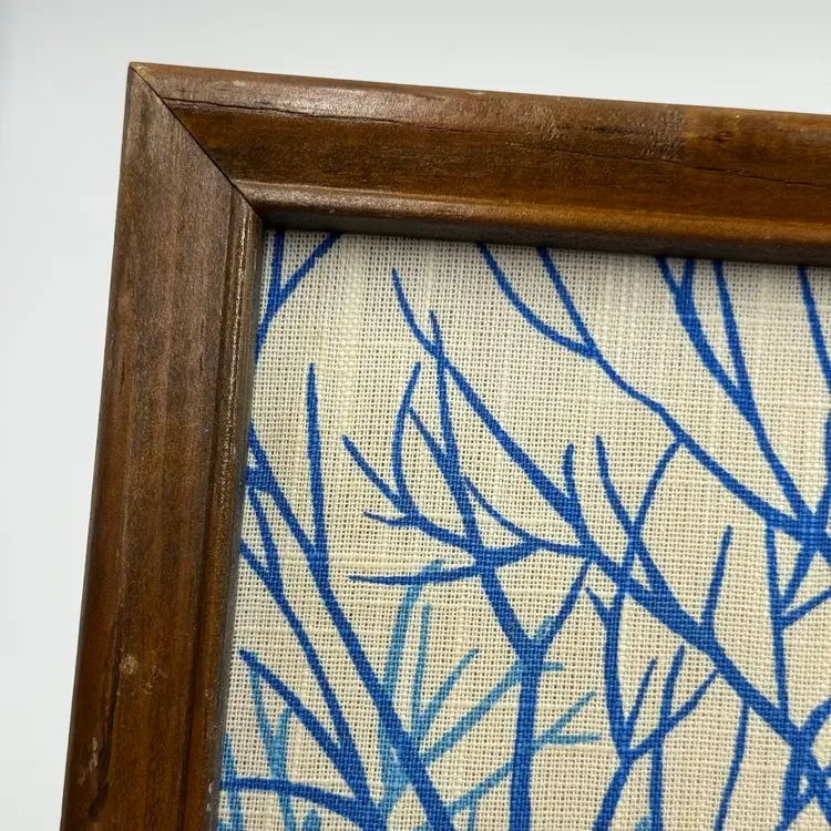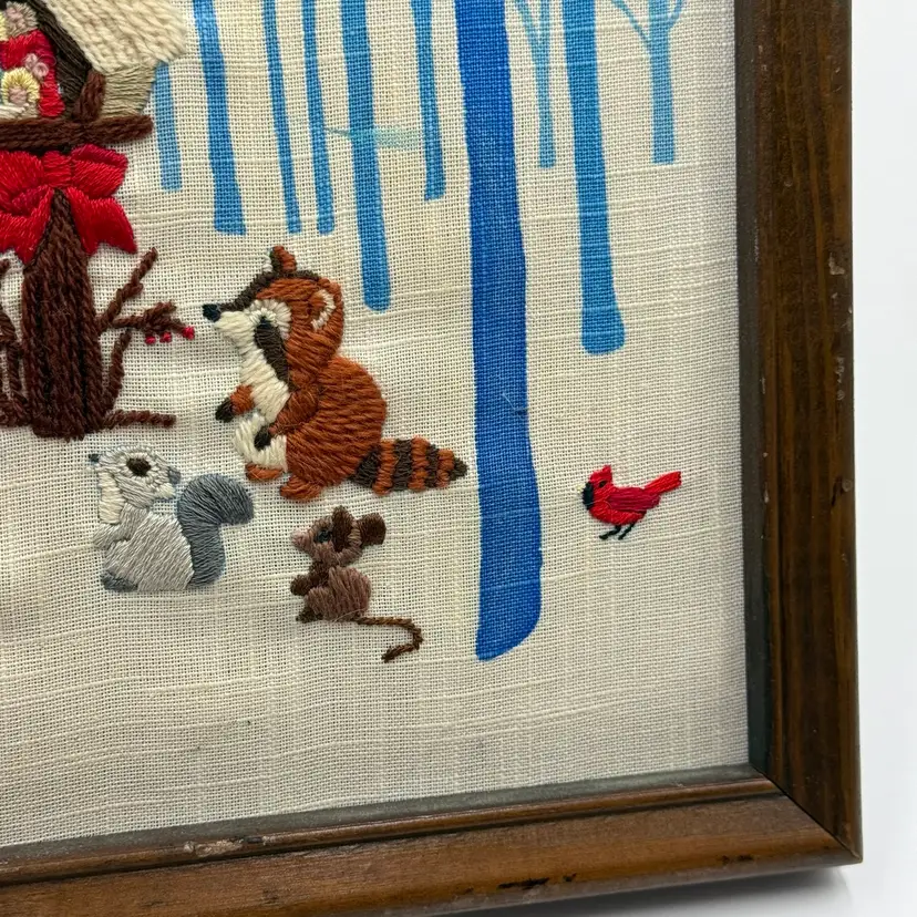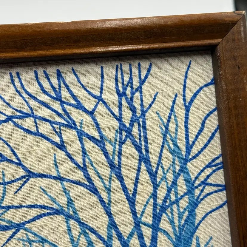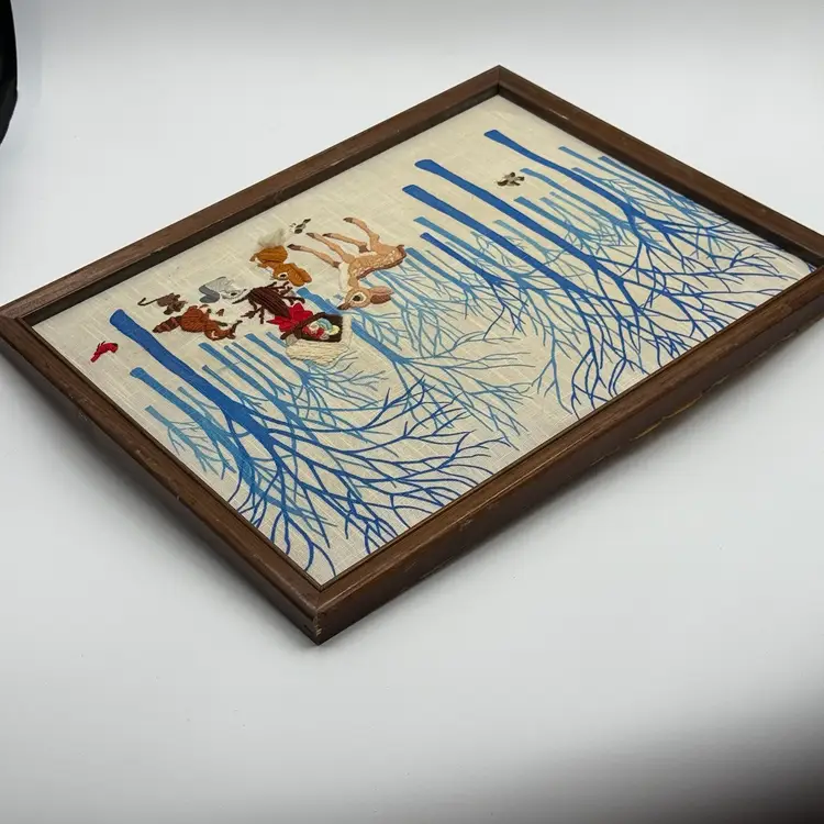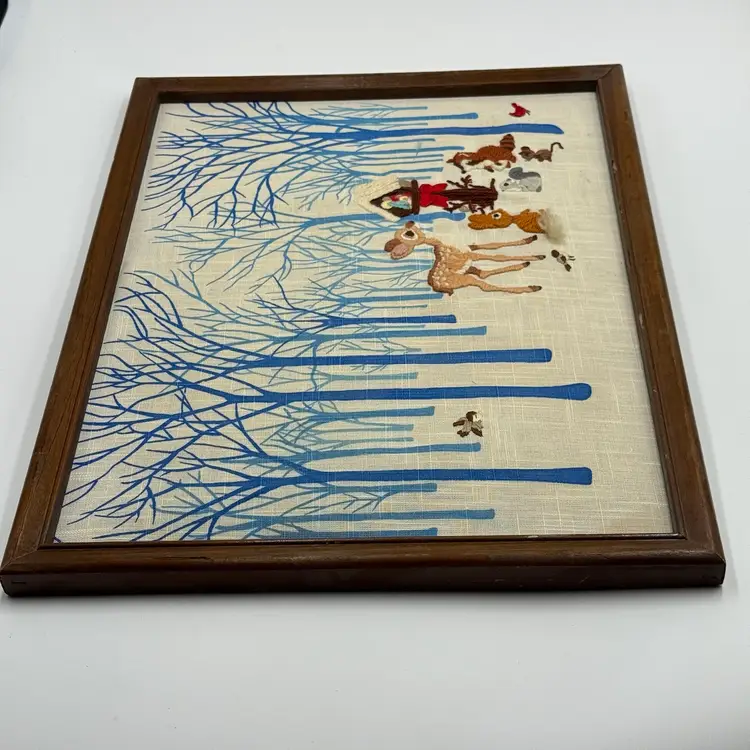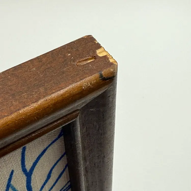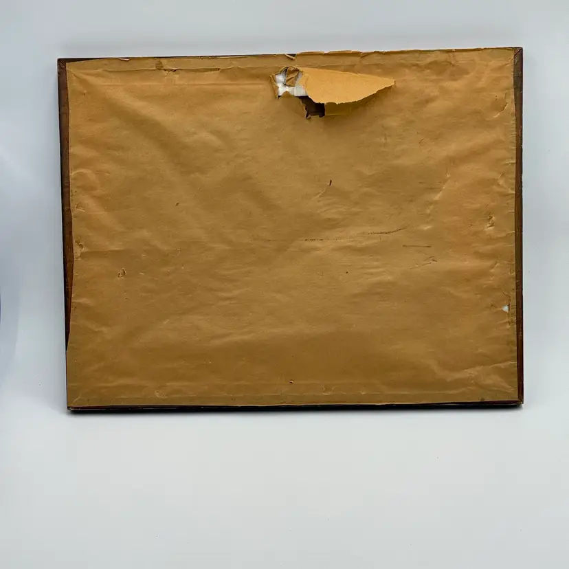 In good condition. There is a tear on the paper backing on the back of the frame. There is some scratches on the wood frame. Measures 17 inches long and 13 inches tall.
