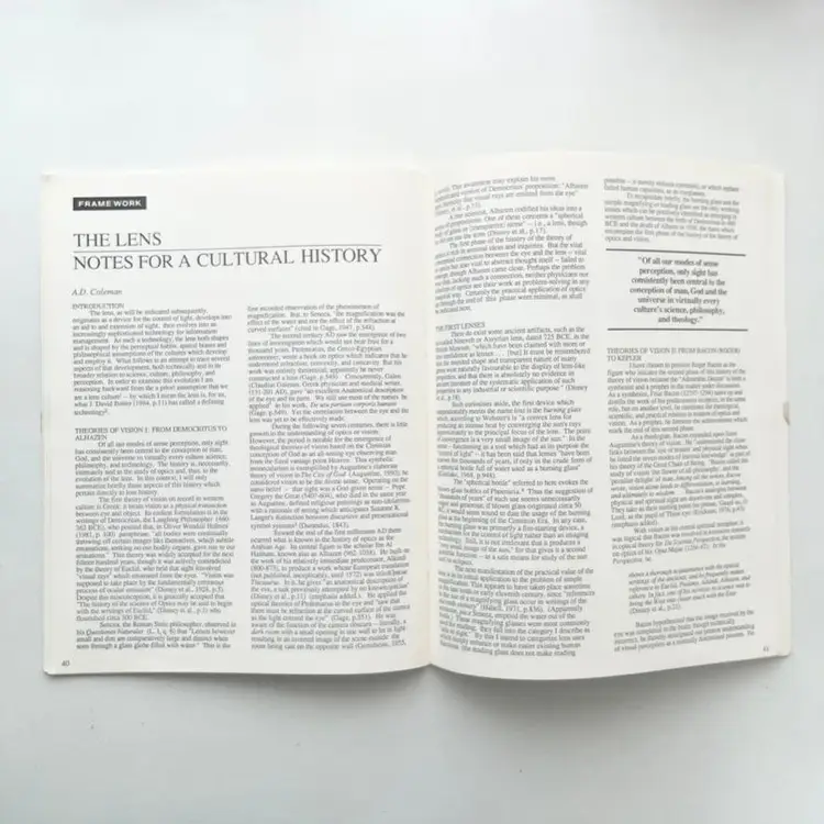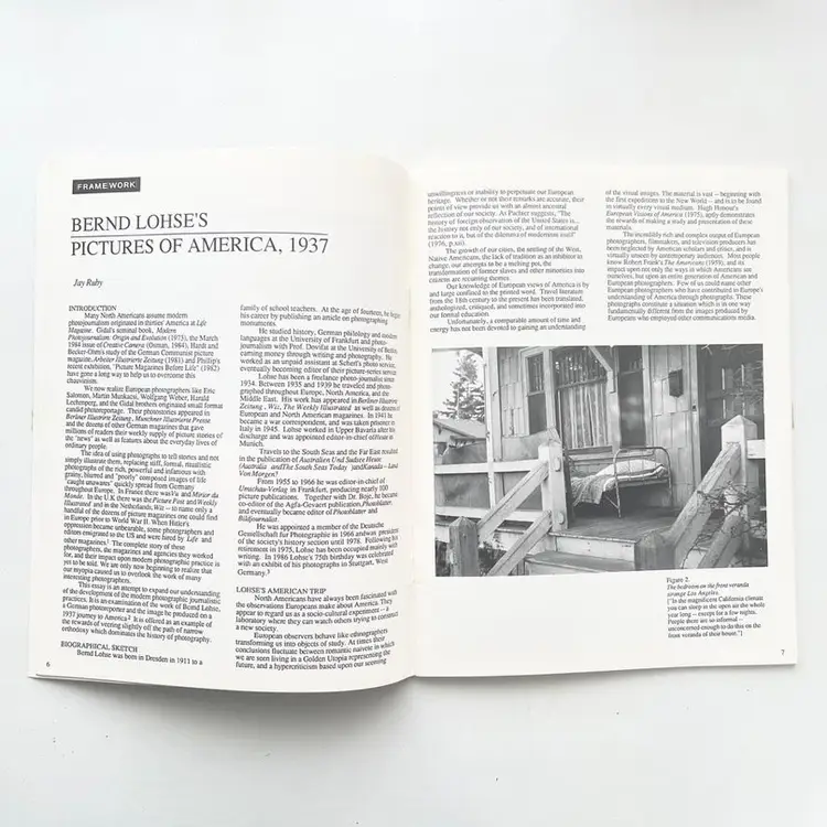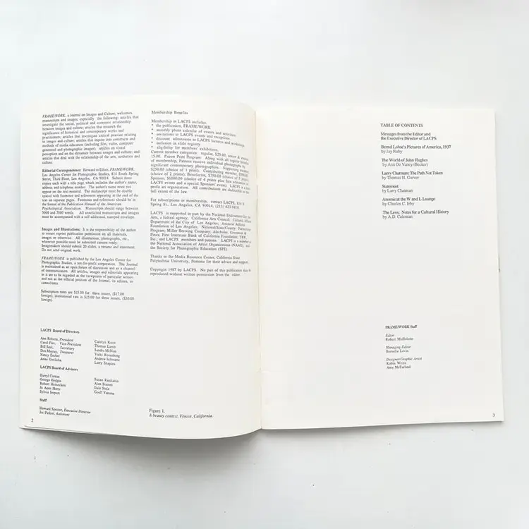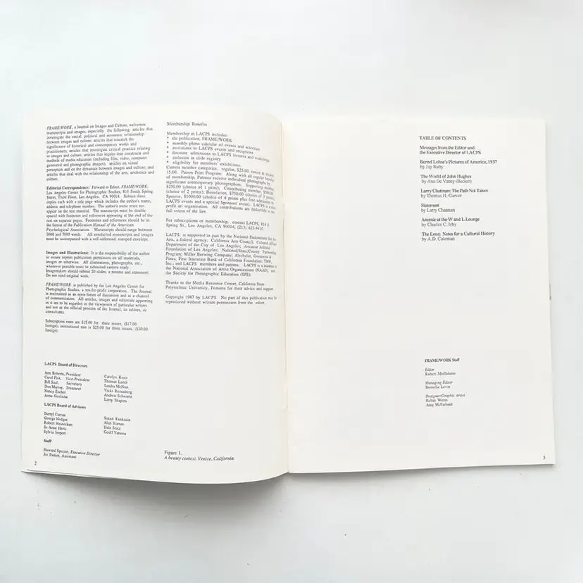 Vintage Photography Magazine Los Angeles California Framework LACPS A Journal on Images and Culture, welcomed manuscripts and images, especially articles that investigated the social, political and economic relationship between images and culture; articles that researched the significance of historical and contemporary works and practitioners, articles that investigate critical practice relating to images of culture; articles that inquire into constructs and methods of media education (including film, video, computer generated photographic images); articles on visual perception and on the dynamics between images and culture; and articles that dealt with the relationship of the arts, aesthetics and culture. Los Angeles Center for Photographic Studies, Los Angeles, California Established in 1974 as a non-profit art organization by a small group of fine-art photographers dedicated to expanding the horizons of photography as an art form and providing resources to the artistic community. Executive Director: Howard Spector Editor: Robert Muffoletto Copyright 1987, LACPS Bern Lohse's Pictures of America, 1937 by Jay Ruby (Photography) The World of John Hughes by Ann De Vancy (Becker) (Films) Larry Chatman: The Path Not Taken by Thomas H Garver (Photography) Statement by Larry Chatman Anomie at the W and L Lounge by Charles C Irby The Lens: Notes for a Cultural History by A D Coleman Cover: A Beauty Contest: Vencie California 47-Page Magazine Condition: Wear around the edges and on the corners. Stains, marks and labels on the covers. The pages are clean. This is a Black and White magazine (No Color). Measures 8-1/2 inches x 11 inches Packaged in a plastic sleeve inside a rigid envelope Visit my store to see more vintage ephemera, advertising, novelties, gifts, estate sale and yard sale finds https://district.net/u/finderspickerspaper SKU B25