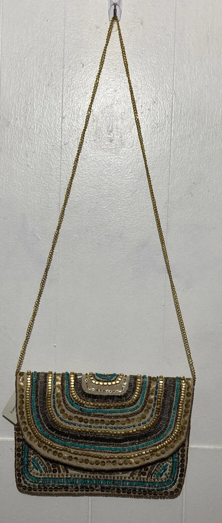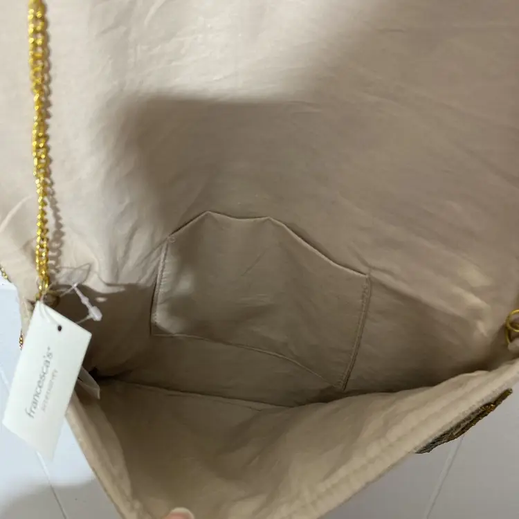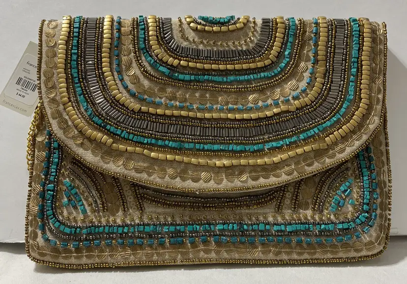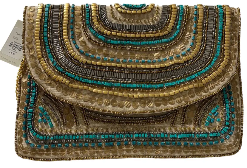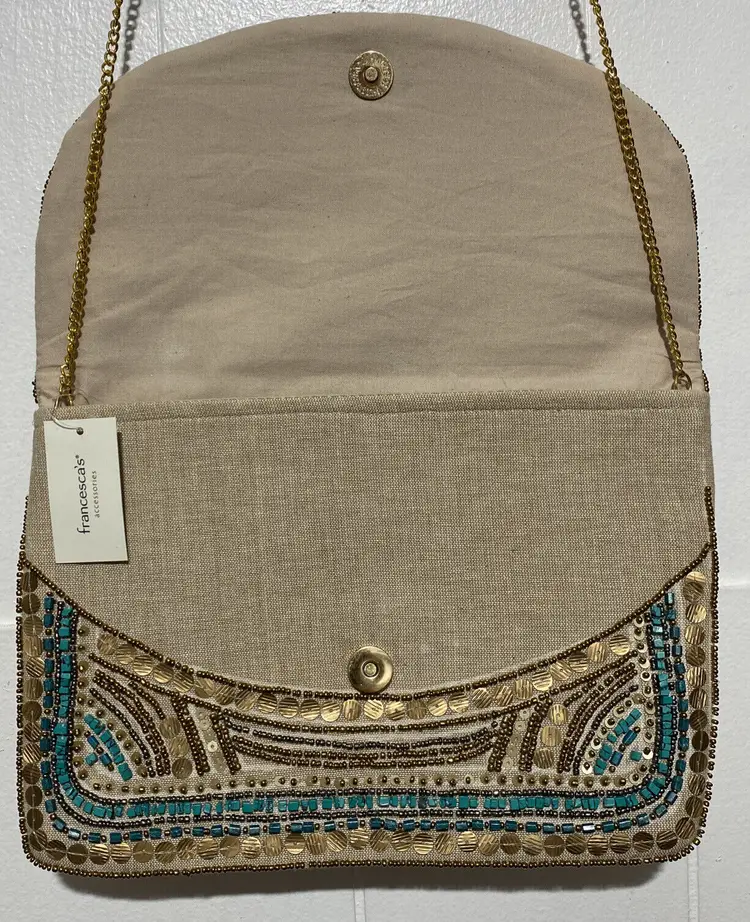 Bag Width: 11 in Closure: Magnetic Bag Height: 7 in Handle/Strap Color: Gold Size: Medium Lining Material: Cotton Exterior Material: Jute Accents: Beaded Brand: francesca's Personalize: No Department: Women Lining Color: Beige Model: francescas kendall Exterior Color: Multicolor Style: Clutch Strap Drop: 21 In Features: Chain Strap Handle/Strap Material: Metal Handmade: No