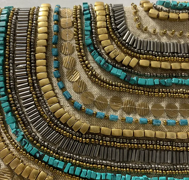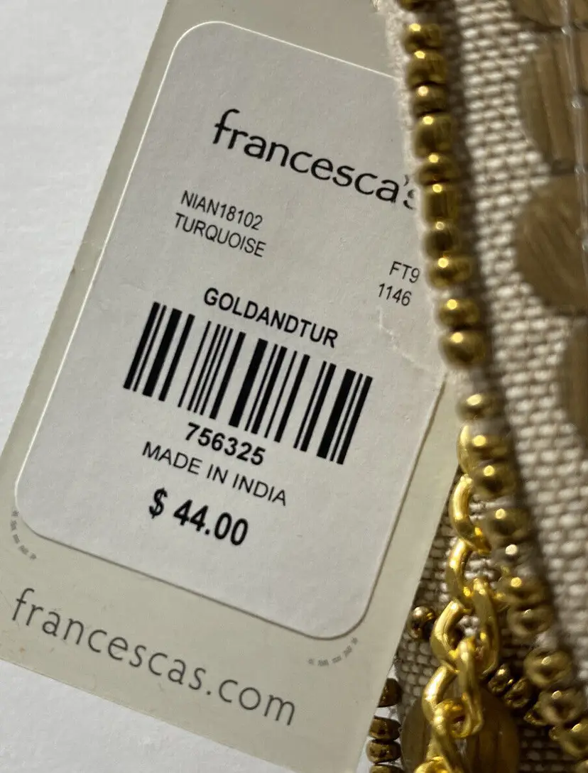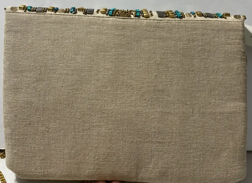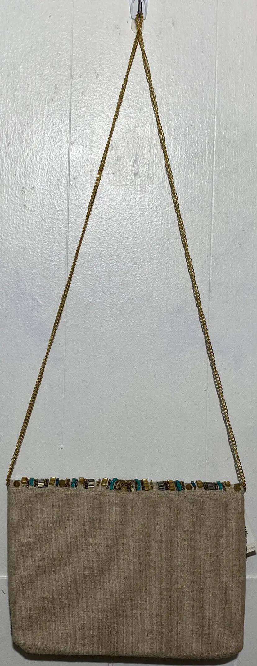 Bag Width: 11 in Closure: Magnetic Bag Height: 7 in Handle/Strap Color: Gold Size: Medium Lining Material: Cotton Exterior Material: Jute Accents: Beaded Brand: francesca's Personalize: No Department: Women Lining Color: Beige Model: francescas kendall Exterior Color: Multicolor Style: Clutch Strap Drop: 21 In Features: Chain Strap Handle/Strap Material: Metal Handmade: No
