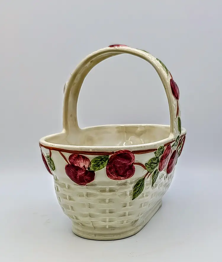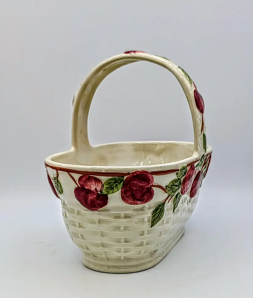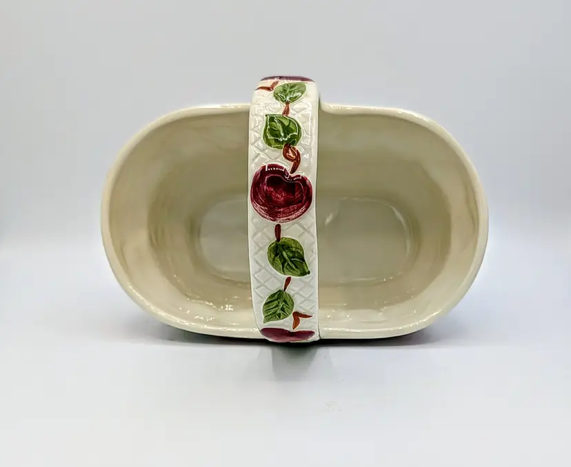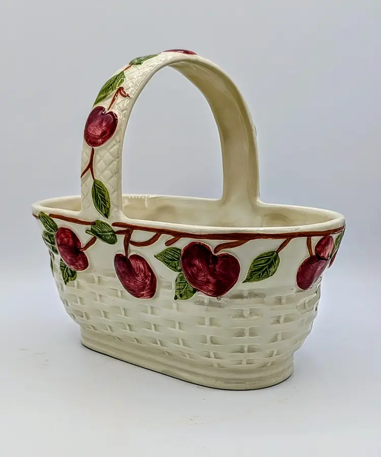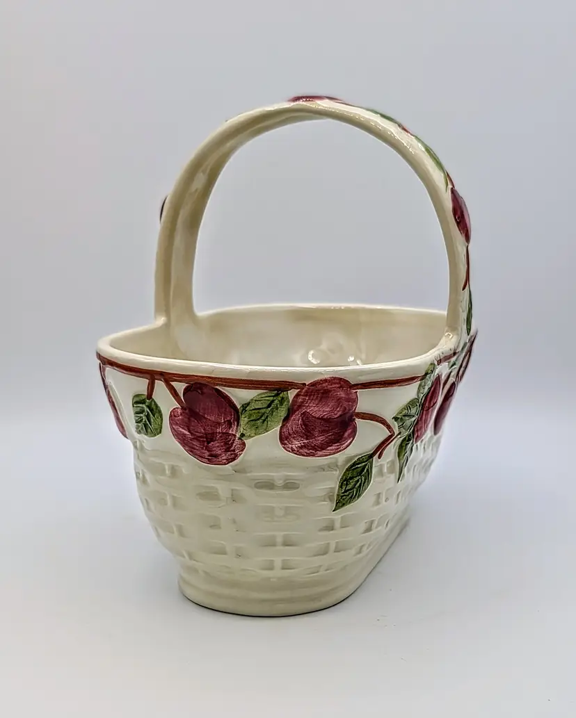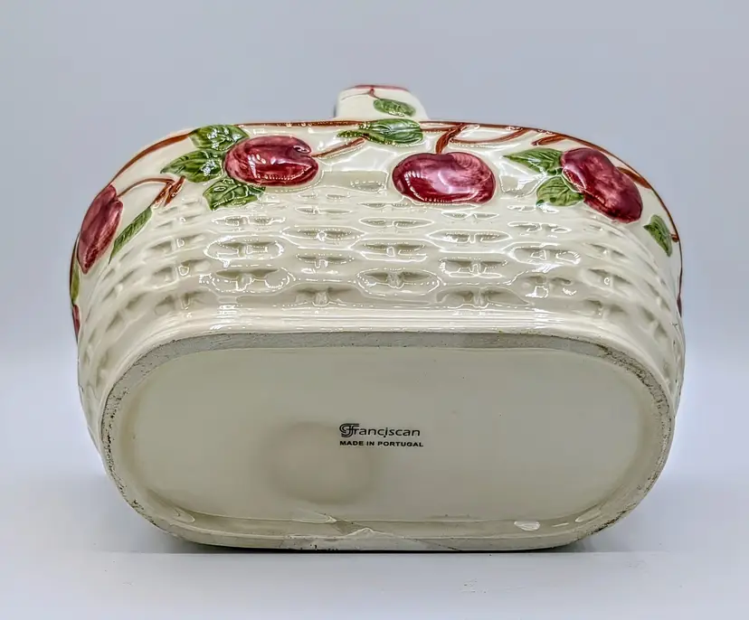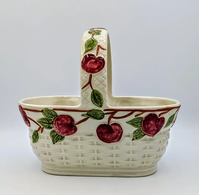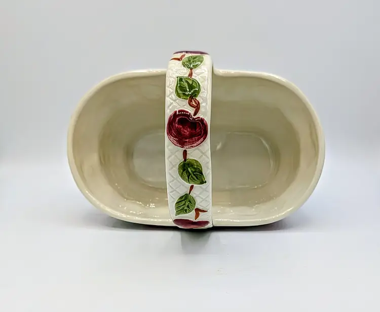 Vintage Franciscan ceramic basket planter in the classic Apple pattern, made in Portugal. Features a raised woven texture with hand-painted red apples and green leaves on a soft cream background. This piece has a charming farmhouse aesthetic and works beautifully as a planter, kitchen décor, or seasonal display. The handled basket design adds both function and visual appeal. Measurements Length: 9 inches Width: 8 inches Height: 6 inches