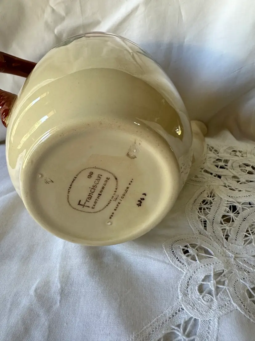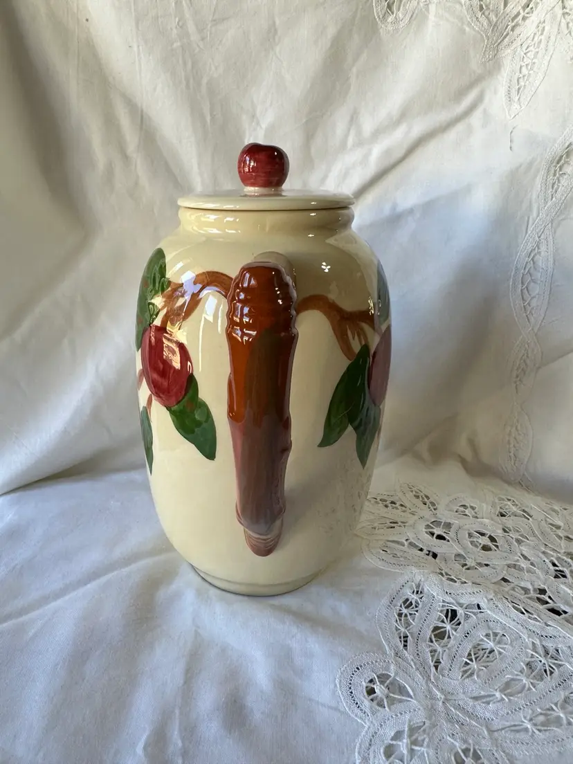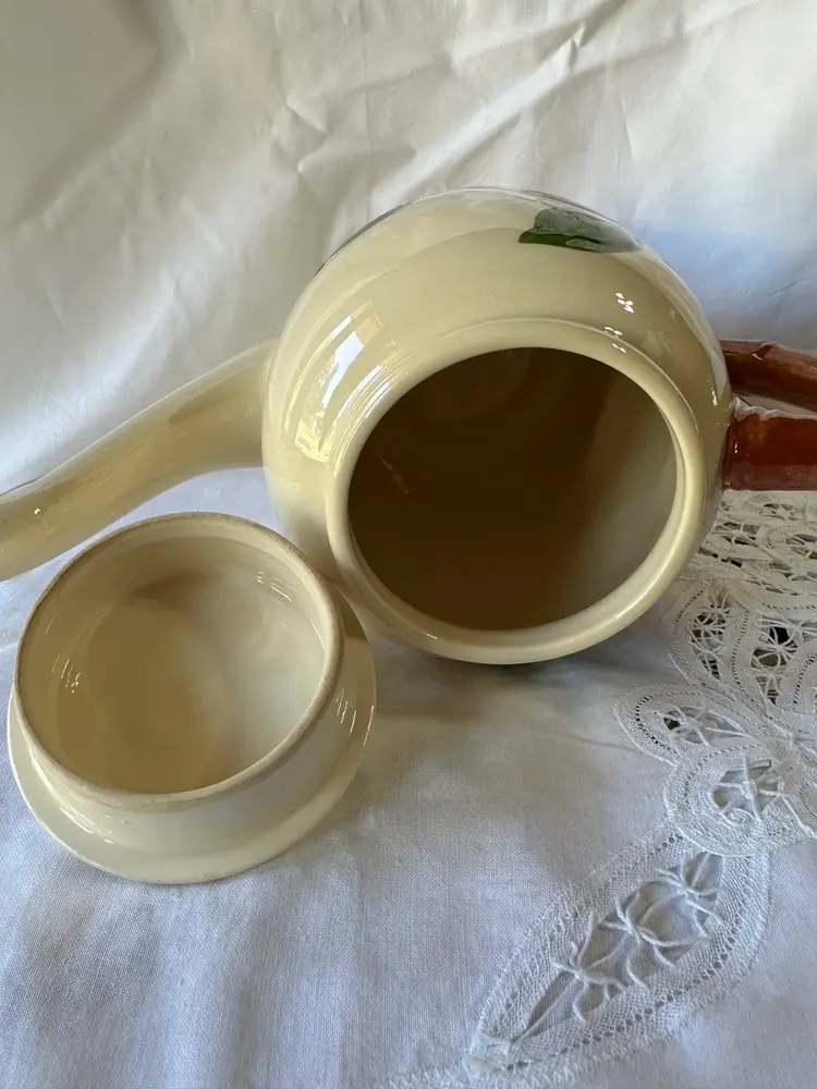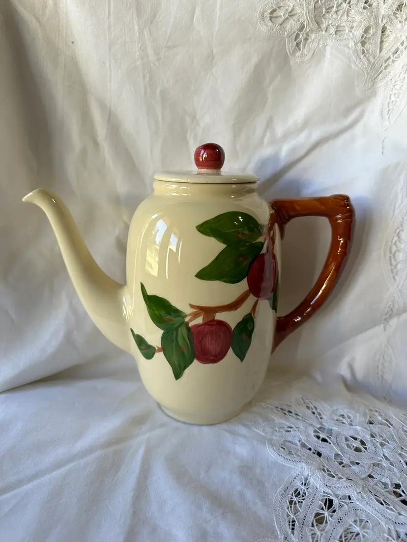 This charming Franciscan Apple Coffee Pot with Lid is a vintage piece that will add character to your kitchen. The beautiful earthenware material is adorned with a delightful apple pattern that will surely catch your eye. Whether you're a collector of Franciscan or just appreciate unique pieces, this coffee pot is perfect for you. Its printed backstamp is a testament to its authenticity and quality. It measures 9” x 10”. It has no chips or cracks.