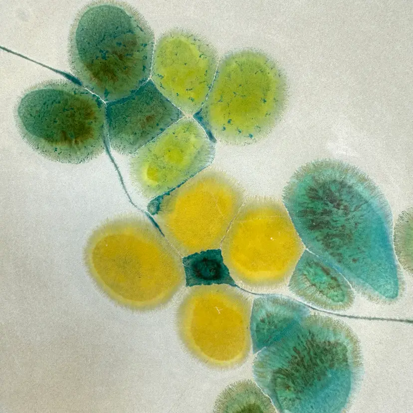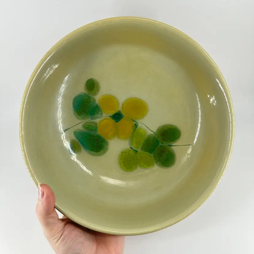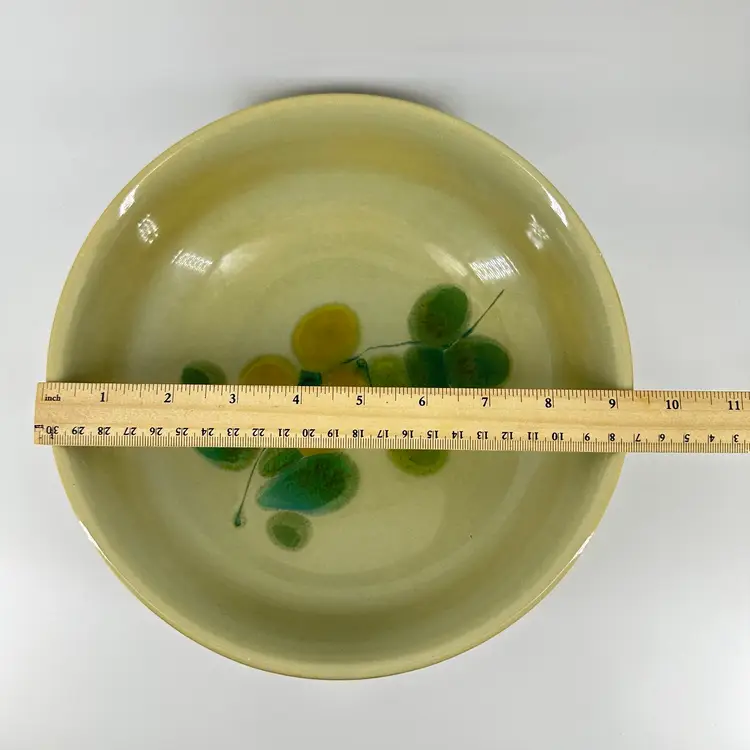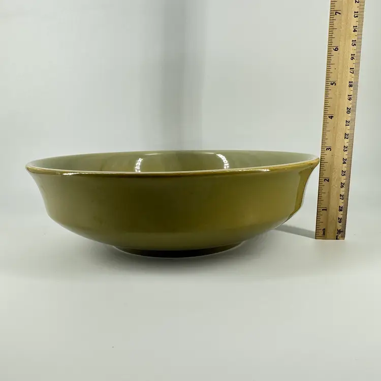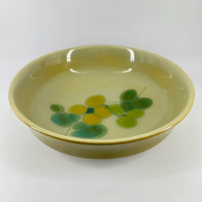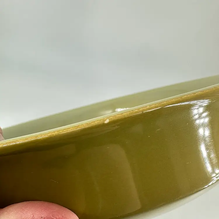 This large bowl is made by Franciscan Earthenware in the style “Pebble Beach”. Bowl includes a “Franciscan Earthware” stamp on the bottom and measures approximately 9.25” across. There are no cracks present, however, slight utensil marks/scratches are detected, as pictured. There is one tiny chip in the glaze on the rim, as pictured. This bowl is oven safe.