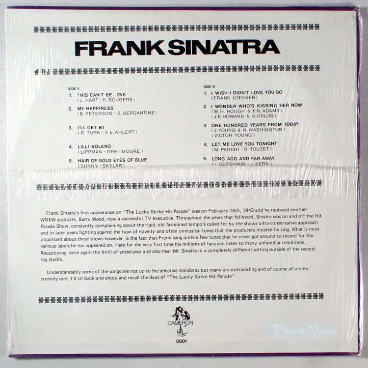 The First Times, by Frank Sinatra, is a collection of songs he sang on The Lucky Strike Hit Parade show that he never got around to record for the various labels he appeared on. Here for the very first time his millions of fans can listen to many unfamiliar renditions. Recapturing once again the thrill of yesteryear and also hear Mr. Sinatra in a completely different setting outside of the recording studio.