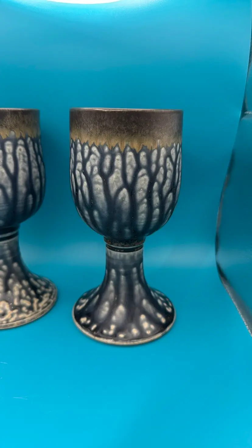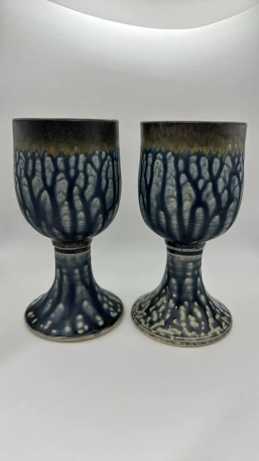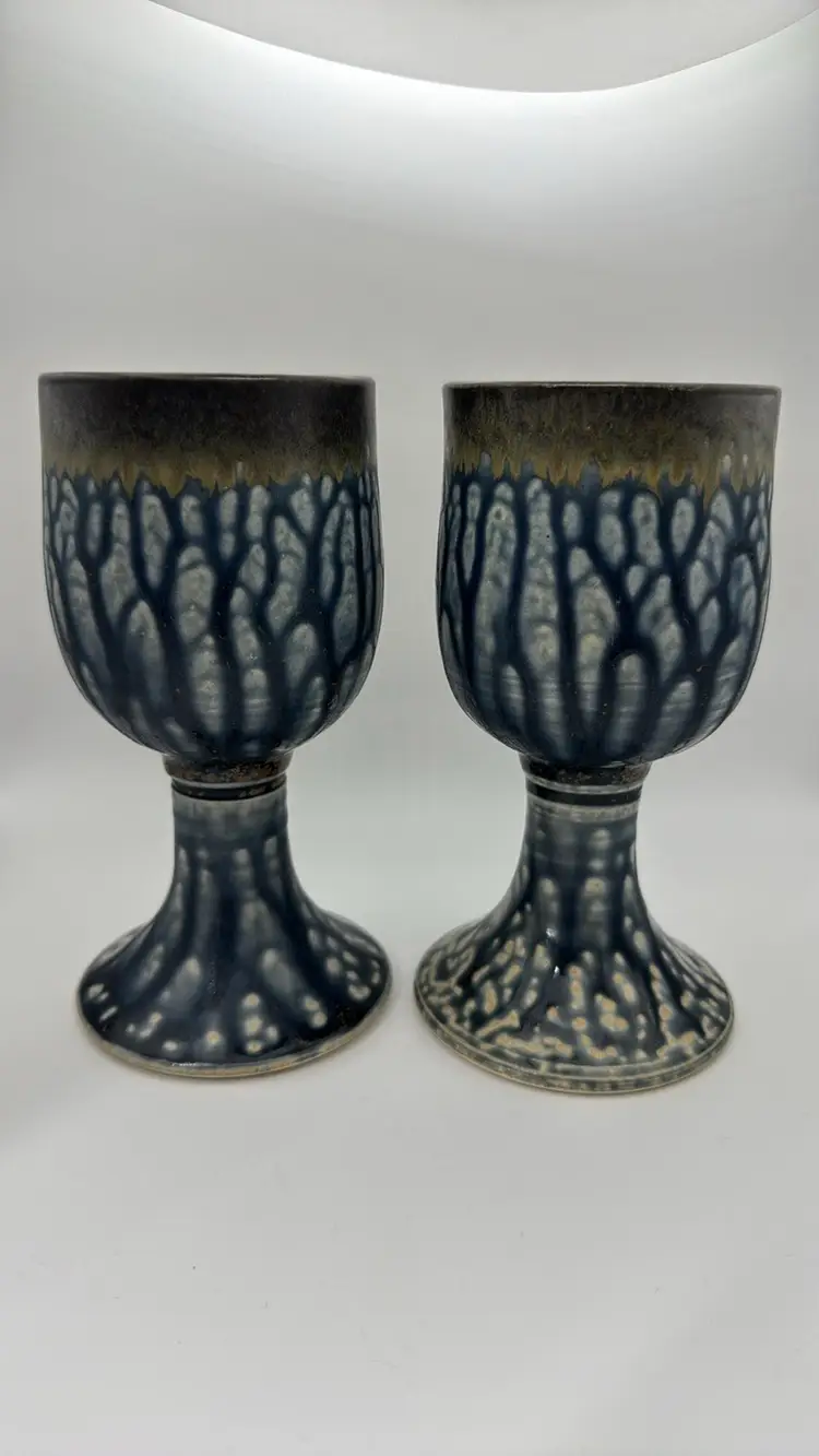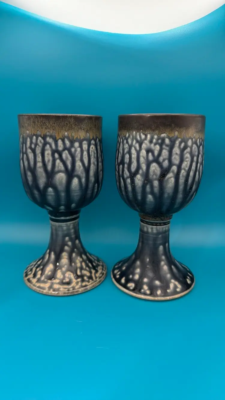 Frank Stofan "Trees" Wood Ash Blue Drip Glazed Pottery set of 2 goblets About 6” tall 2.75” diameter opening Frank Stofan is a potter From Cambridge Springs, PA This is beautiful and unique pottery it’s like new with no breaks or chips (65961725*)