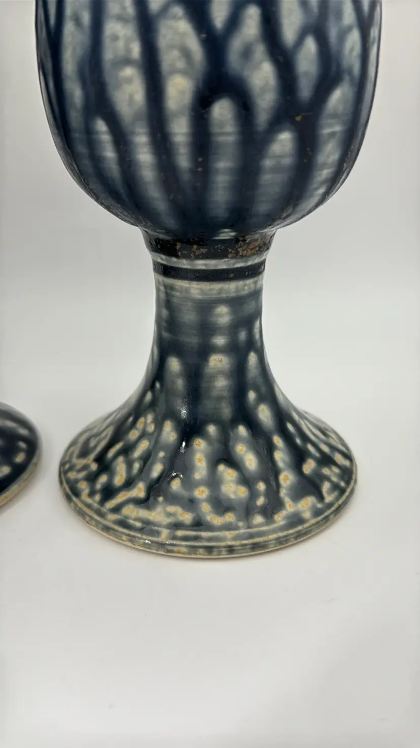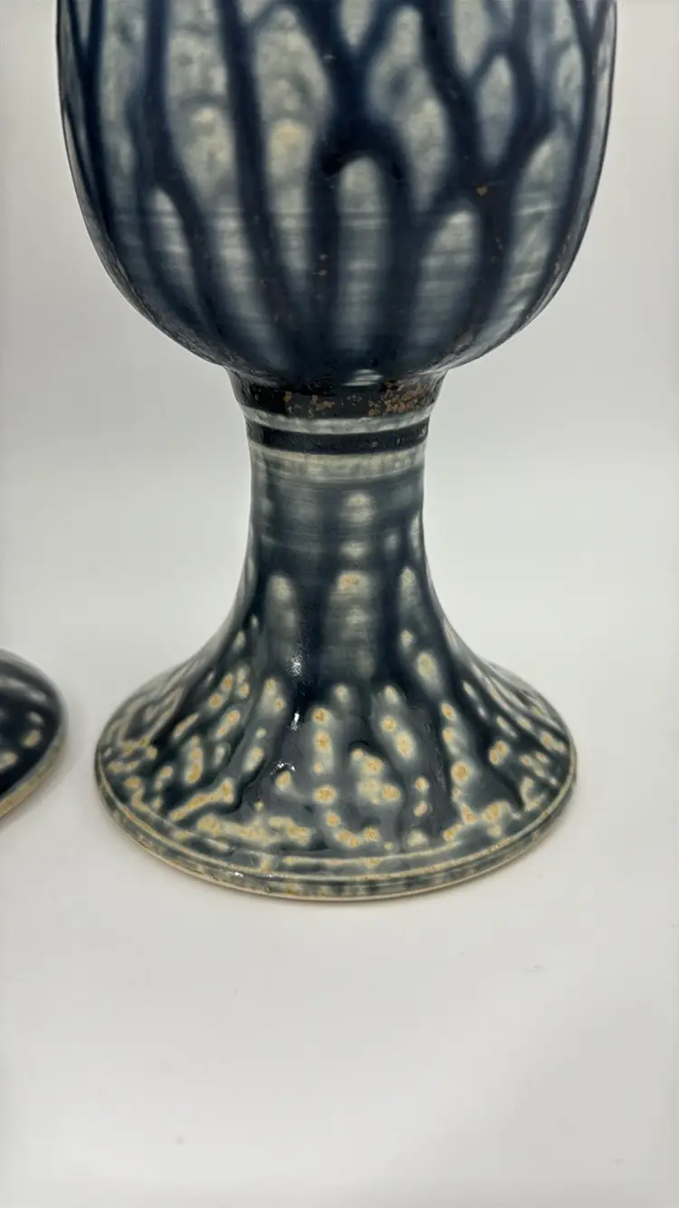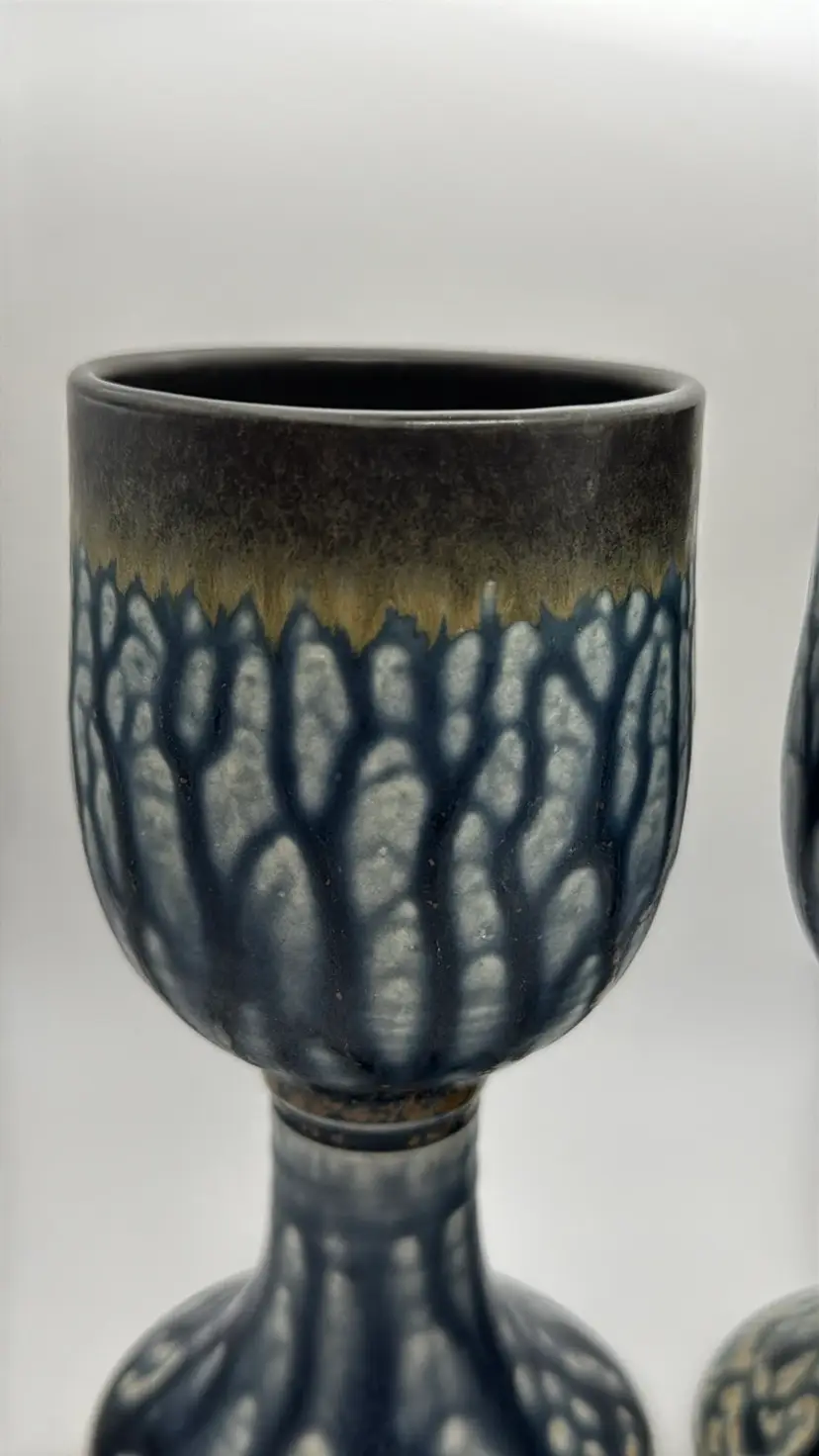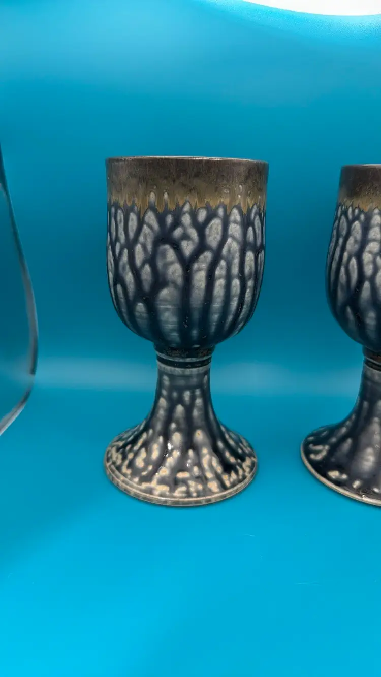 Frank Stofan "Trees" Wood Ash Blue Drip Glazed Pottery set of 2 goblets About 6” tall 2.75” diameter opening Frank Stofan is a potter From Cambridge Springs, PA This is beautiful and unique pottery it’s like new with no breaks or chips (65961725*)