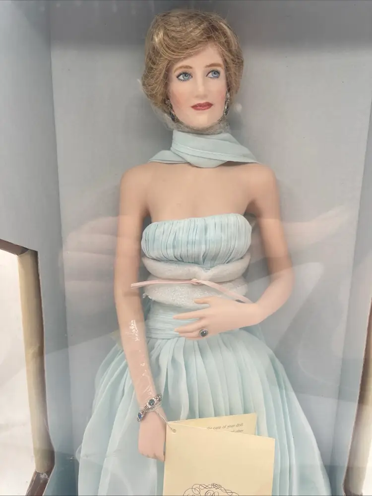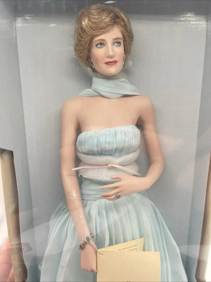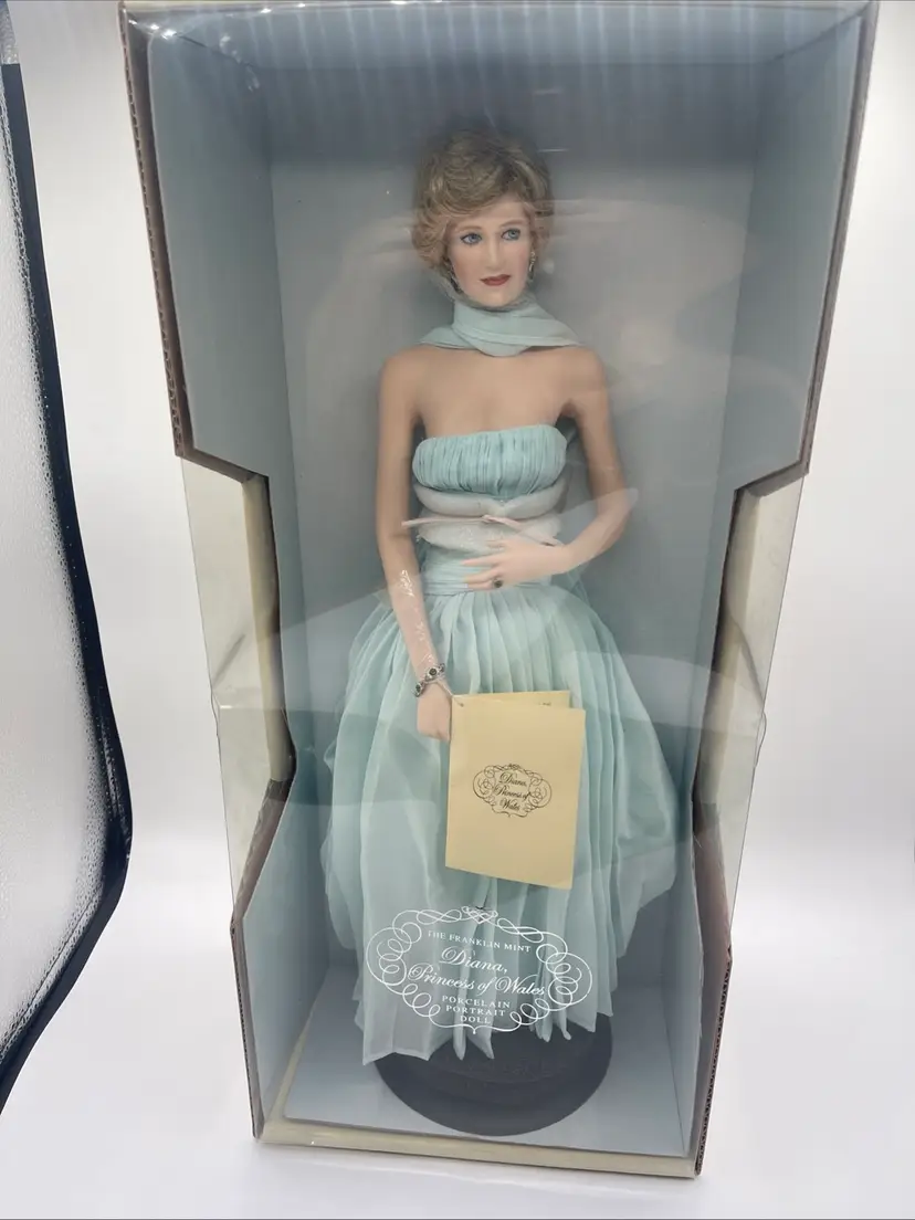 This is new in the box never been out of the box comes with the tags and accessories. She’s 17 inches long. She’s wearing the blue chiffon dress. This is one of eight different Diana Prince of Wales portrait, porcelain dolls by the Franklin mint that I am listing if you’re interested in more than one and would like to do a bundle deal I’ll reach out to Me. Thank you for looking.