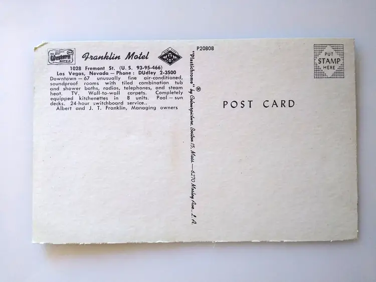 Unit of Sale: Single Unit Number of Items in Set: 1 Occasion: Any Signed: No Size: Standard (5.5 x 3.5 in) Year Manufactured: 1955 Material: Paper City: Las Vegas Original/Licensed Reprint: Original Brand/Publisher: Colourpicture Subject: Motel Type: Printed (Lithograph) Continent: North America Era: Photochrome (1939-Now) Country: United States Region: Nevada Theme: Automobiles, Cars, Cities & Towns, Hotel & Restaurant, Pool, Swimming, Swimming Pool, Tourism, Transportation Features: Chrome Time Period Manufactured: 1950-1959 Country/Region of Manufacture: United States Postage Condition: Unposted