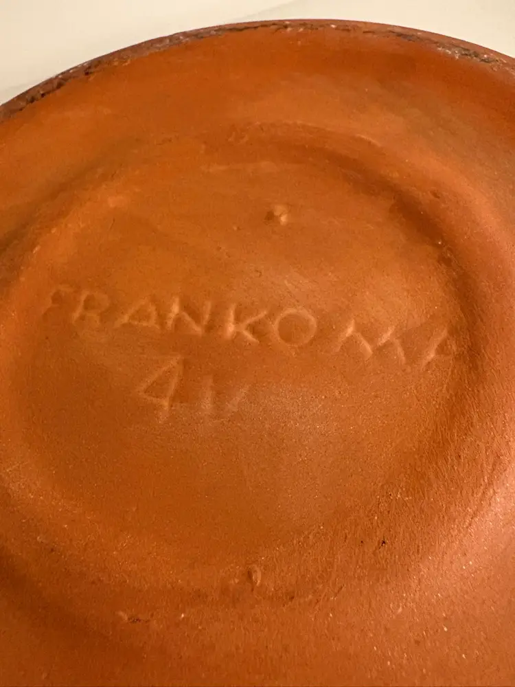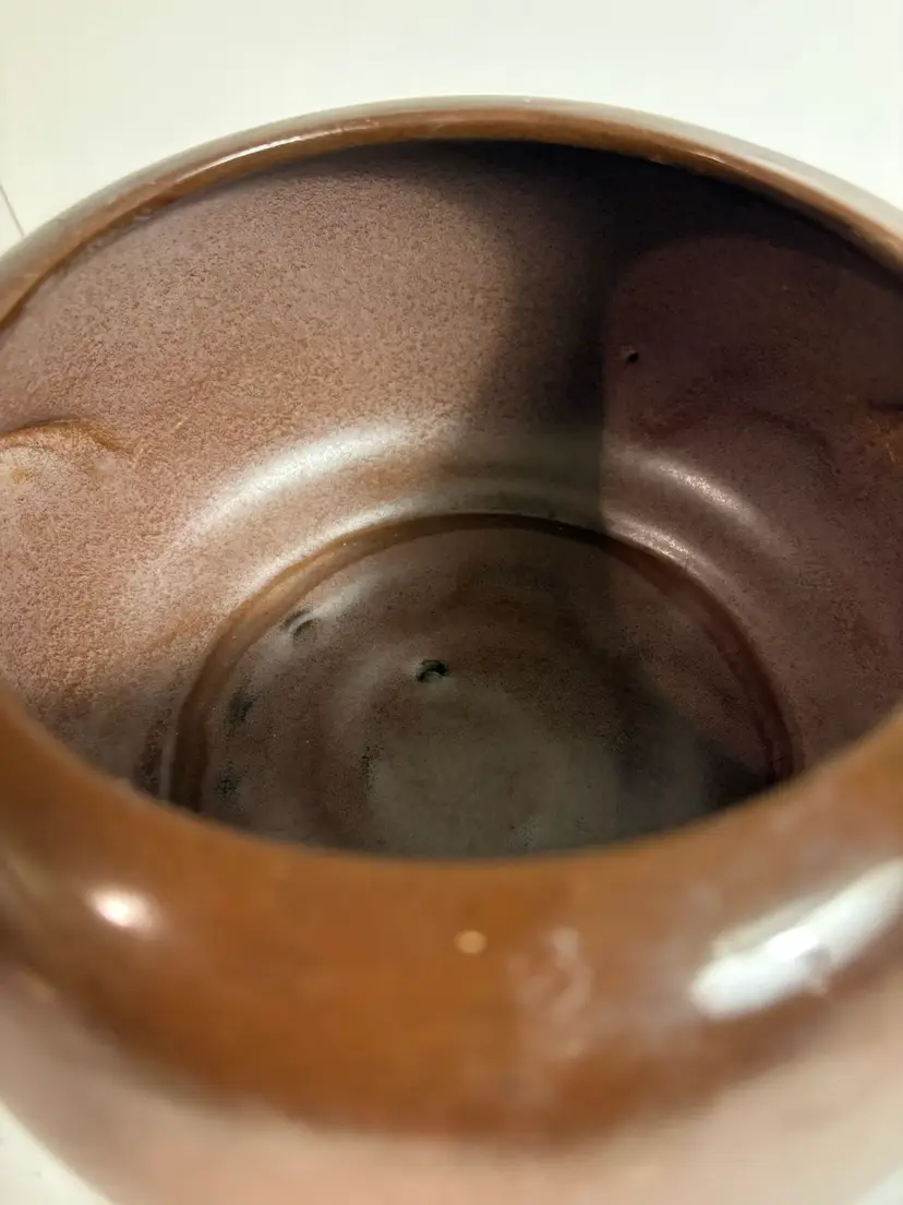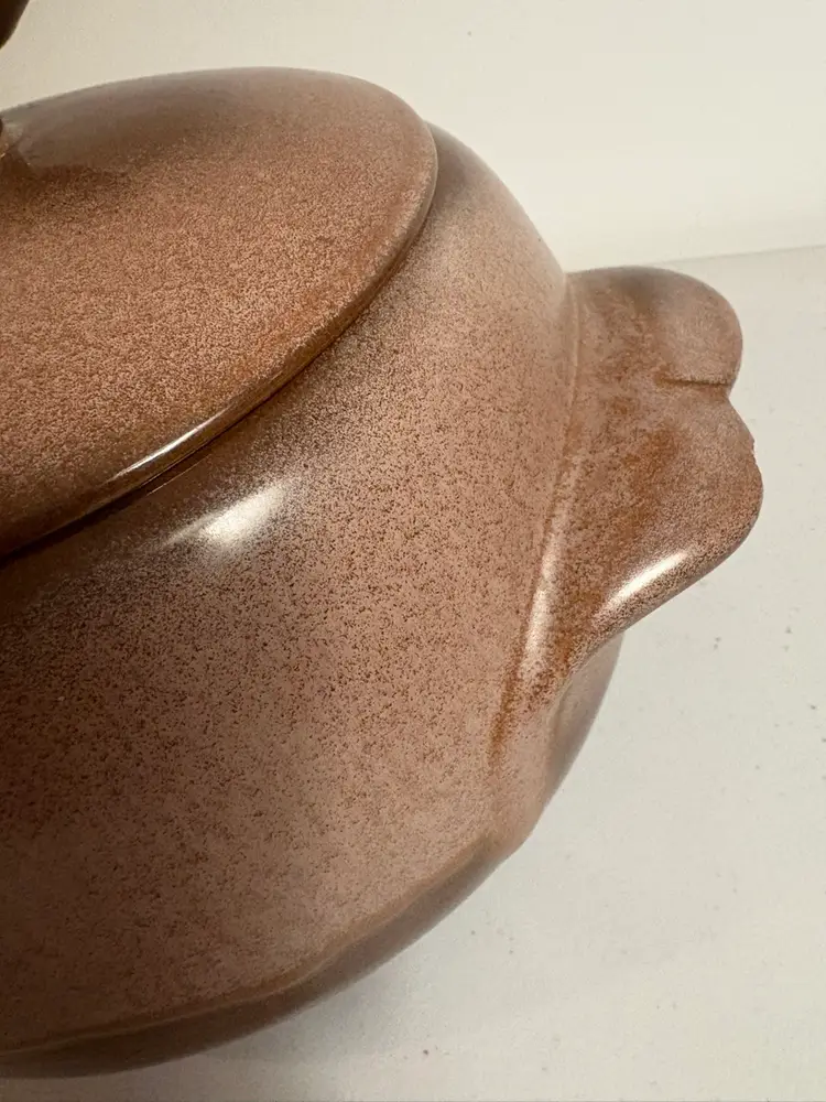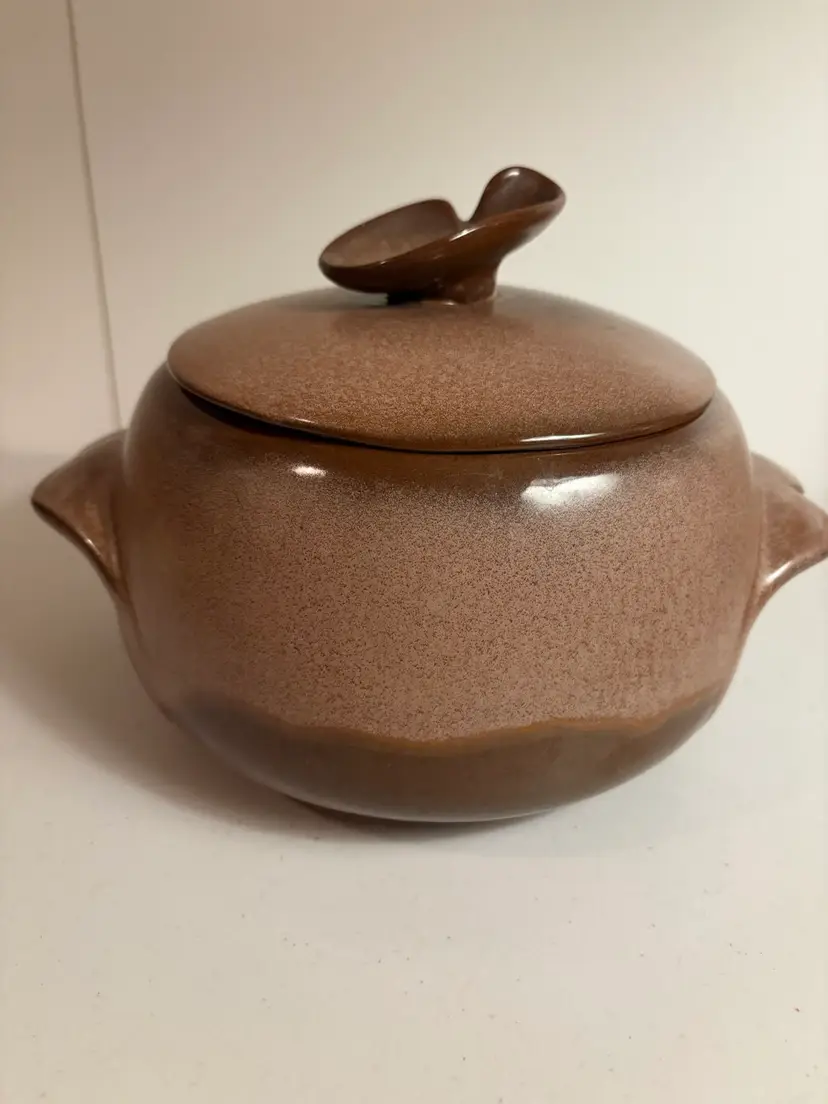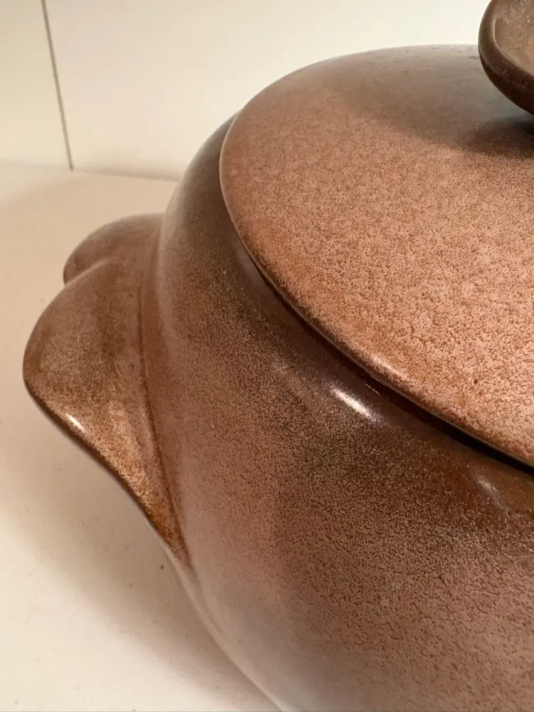 This vintage Frankoma Pottery Bean Pot Lid in Plainsman Brown is a 4V 2 Qt Round Covered Casserole from 1965. Made of clay with a glossy ceramic finish, this original mid-century modern piece features an impressed backstamp and is heat-resistant. Perfect for cooking and serving, this casserole is a stylish and functional addition to any kitchen, weighing 2 lb 12 oz. Proudly made in Oklahoma, USA, this piece showcases the beauty of traditional pottery craftsmanship.